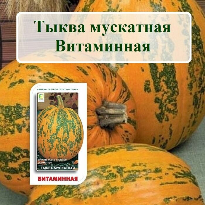 Тыква Витаминная - позднеспелый сорт, отличающийся высокой урожайностью Растение - длинно-плетистое с овальными широкими плодами. Мякоть сочная, мясистая, хрустящая, ярко-оранжевого оттенка, толщиной до 8-0 см. Кожура - тоненькая. Период созревания длится от 120 до 140 дней. Масса тыквы достигает примерно 7 кг.