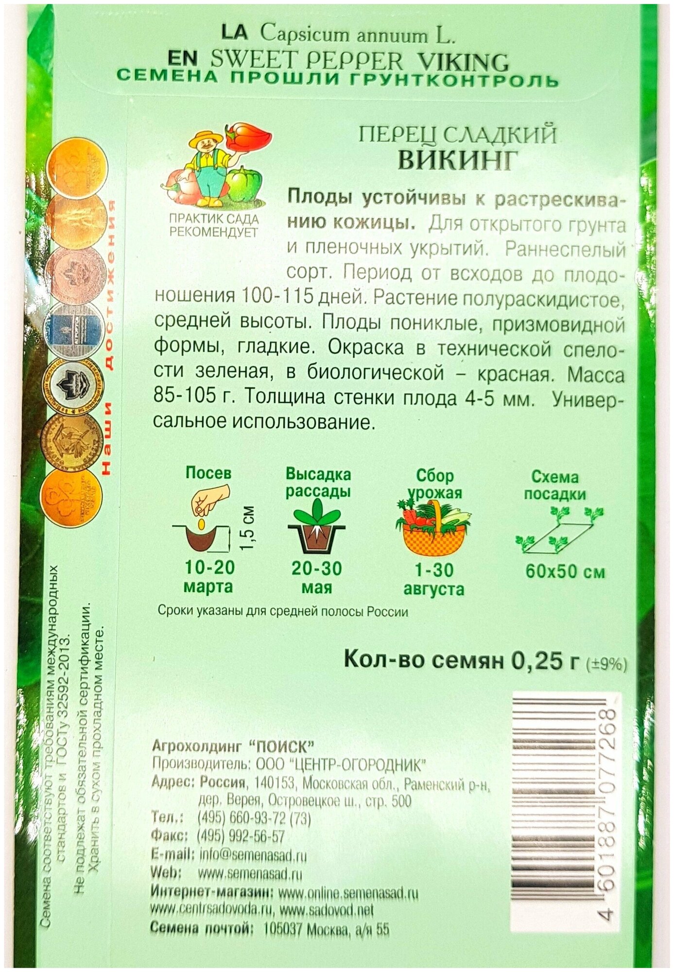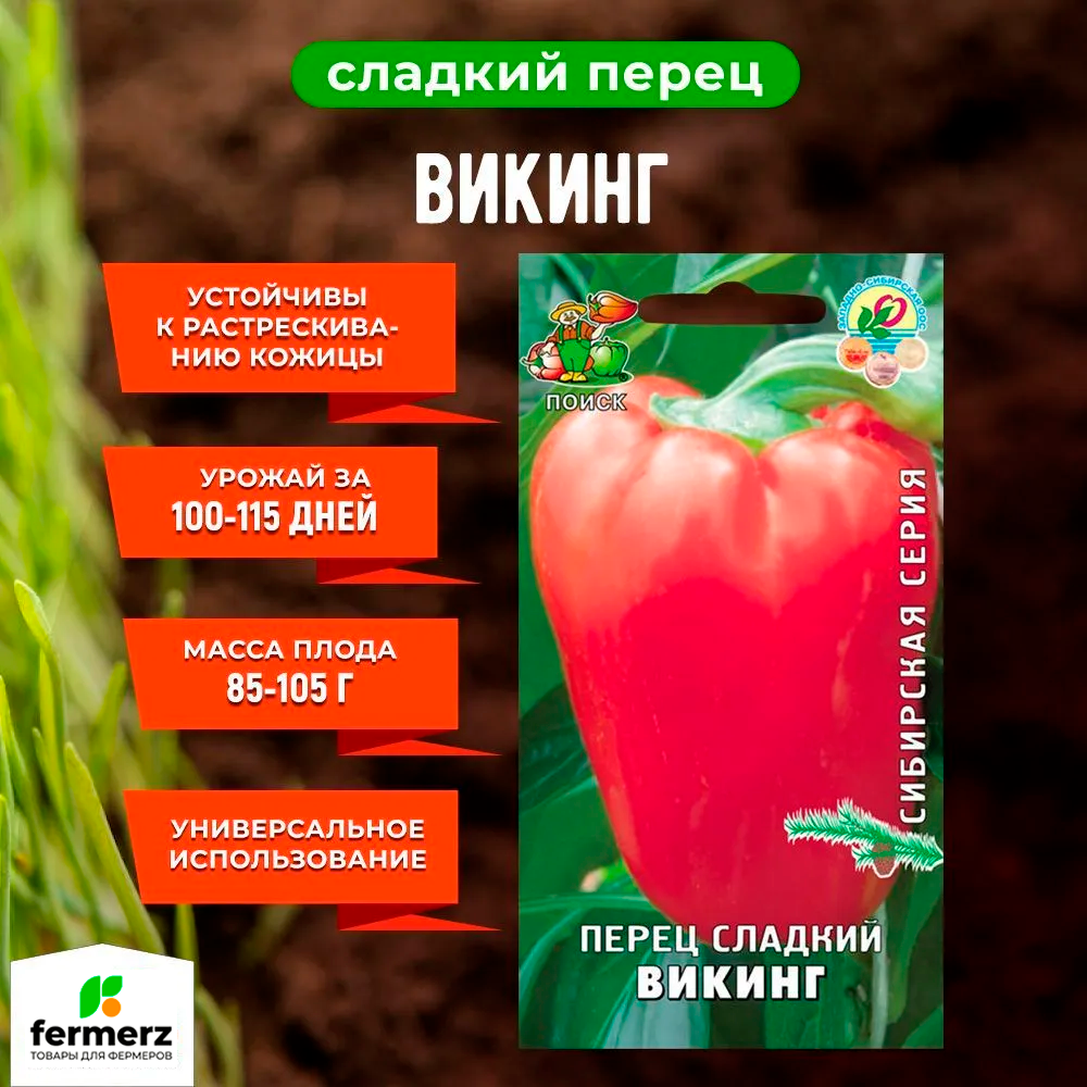 Перец сладкий Поиск Викинг относится к теплолюбивым культурам, однако без особого труда выращивается в умеренном климате. Овощ созревает на протяжении 110-120 дней, поэтому сорт считается среднеспелым. Зрелые плоды отличаются крупным размером, массой 85-105 гр, призмовидной формой, красным цветом и толстыми стенками 4-5 мм. Сочный перец Викинг имеет выраженный аромат и нежную кожицу.