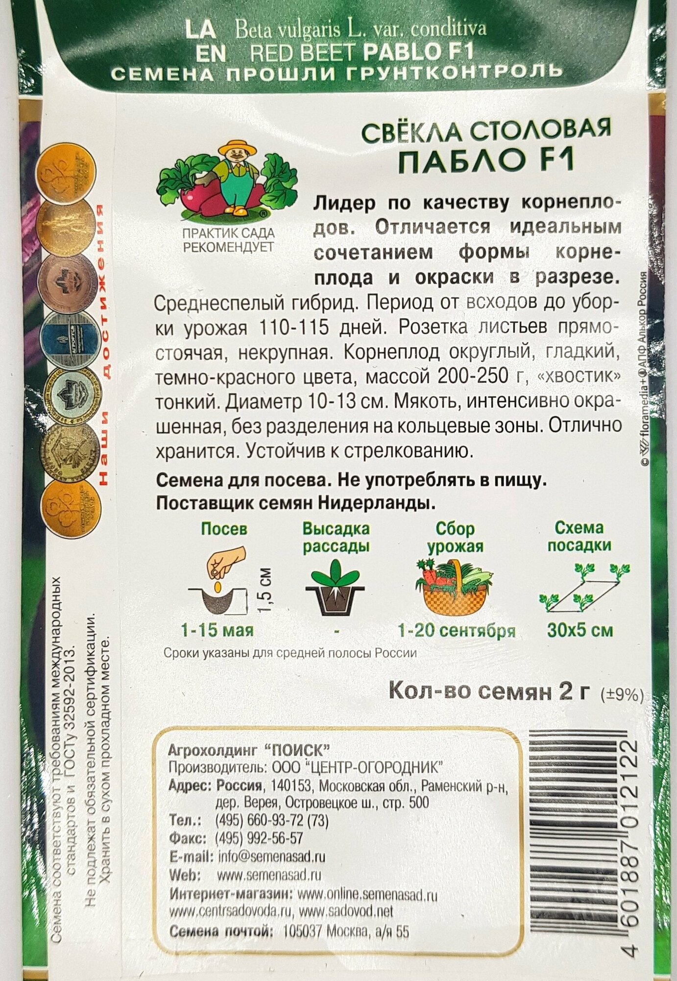 Свекла Пабло F1 - овощная гибридная культура, богатая на витамины. Хорошо растет на территории России, Молдовы, в том числе и в холодных зонах. Сорт устойчив к распространенным заболеваниям, к неблагоприятным погодным условиям, поэтому отличается высоким урожаем. Не требует особого ухода.