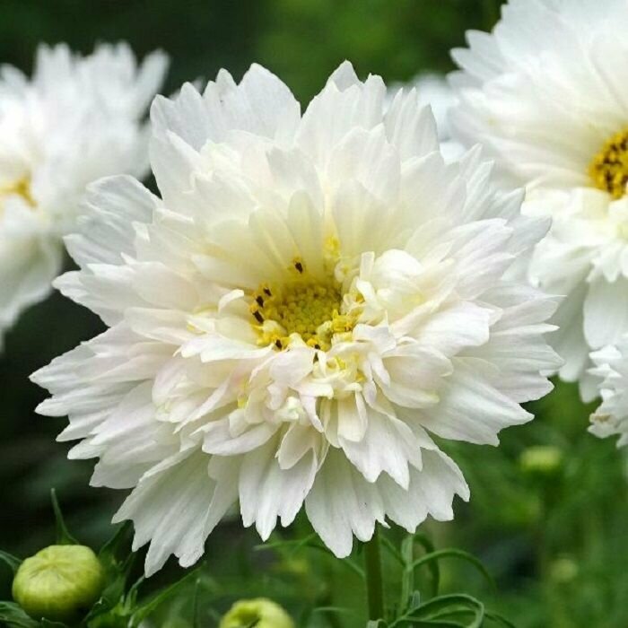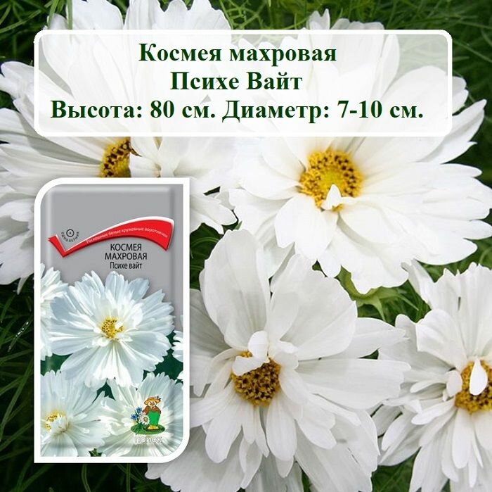 Светолюбивое и холодостойкое растение, осветляющее любой участок своими белоснежными соцветиями. Отличается относительно высоким стеблем - до 80 сантиметров. Соцветия представляют собой махровые корзинки, при этом цветы отлично подходят для срезки и отличаются стойкостью при помещении в воду. Лучшие результаты космея показывает на легких почвах, но в целом считается нетребовательным к грунту растением.