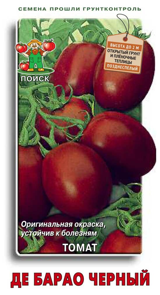 Томат Поиск Де Барао черный отличается необычным, коричневым с фиолетовым отливом, похожим на темную вишню, цветом плодов. Помидоры имеют прекрасный насыщенный вкус и сладкое послевкусие. Растение подходит и для теплиц, и для открытого грунта. Это индетерминантный сорт, поэтому в росте он не останавливается, достигая двух метров в высоту. С момента появления всходов до снятия урожая позднеспелого сорта томатов Де Барао проходит около четырех месяцев - примерно 120-130 дней. Важный момент - плоды дозревают после снятия с куста.