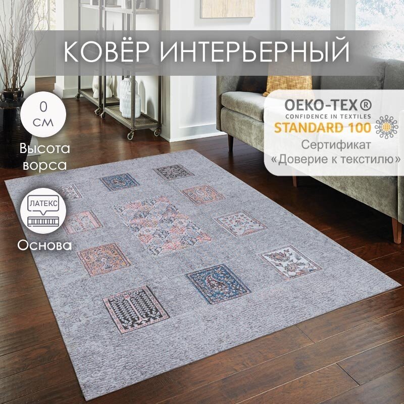 Тканый ковер гобеленового плетения из высококачественных современных материалов (49% полиэстер, 28% акриловый шенилл, 23% хлопок) на противоскользящей основе из латекса. Плотность +/- 1100 г / кв.м., в основе 6 нитей, уток – 3 нити. Оригинальный дизайн дополнит или обновит Вашу гостиную или спальню.В связи с технологическими особенностями производства, рисунок может пропорционально изменяться в зависимости от размера изделия, не влияя на общий внешний вид. Товар сертифицирован по стандарту OEKO-TEX «Доверие текстилю».