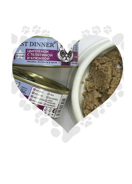 Консервы Бест Диннер для кошек Цыпленок с телятиной и клюквой (цена за упаковку) - Крупные мясные волокна в желе для профилактики мочекаменной болезни. Клюква особенно необходима для кастрированных котов и стерилизованных кошек, у которых высок риск заболеваний выделительной системы. Телятина – ценное мясо: она богата протеинами, многочисленными витаминами и аминокислотами. Кошки любят телятину за нежные и мягкие волокна, тонкий мясной аромат и приятное чувство насыщения. Цыпленок - источник полноценного животного белка, необходимого для восстановления мышц, кроветворения и других жизненно важных функций; коллагена и эластина, поддерживающих здоровье суставов. Являясь диетическим мясом, он не позволит кошке набрать лишний вес, не перегрузит ее пищеварение и почки. Дрожжи полезны для кожи и шерсти, работы желудка и кишечника, укрепляют иммунитет. Таурин - незаменимая аминокислота, которая важна для здоровья глаз, шерсти, органов пищеварения, мочеполовой и репродуктивной систем. Юкка Шидигера снижает запах из лотка и выводит токсины из организма. Большое содержание влаги необходимо для правильного функционирования выделительной системы. Позаботьтесь о здоровье любимца вместе с Best Dinner! Состав: Курица, телятина, субпродукты птичьи, плазма крови, масло подсолнечное, клетчатка, отруби пшеничные, яичный порошок, таурин, дрожжи, рыбий жир, морские водоросли, юкка шидигера, клюква, травы почечный сбор, карамель, желе.