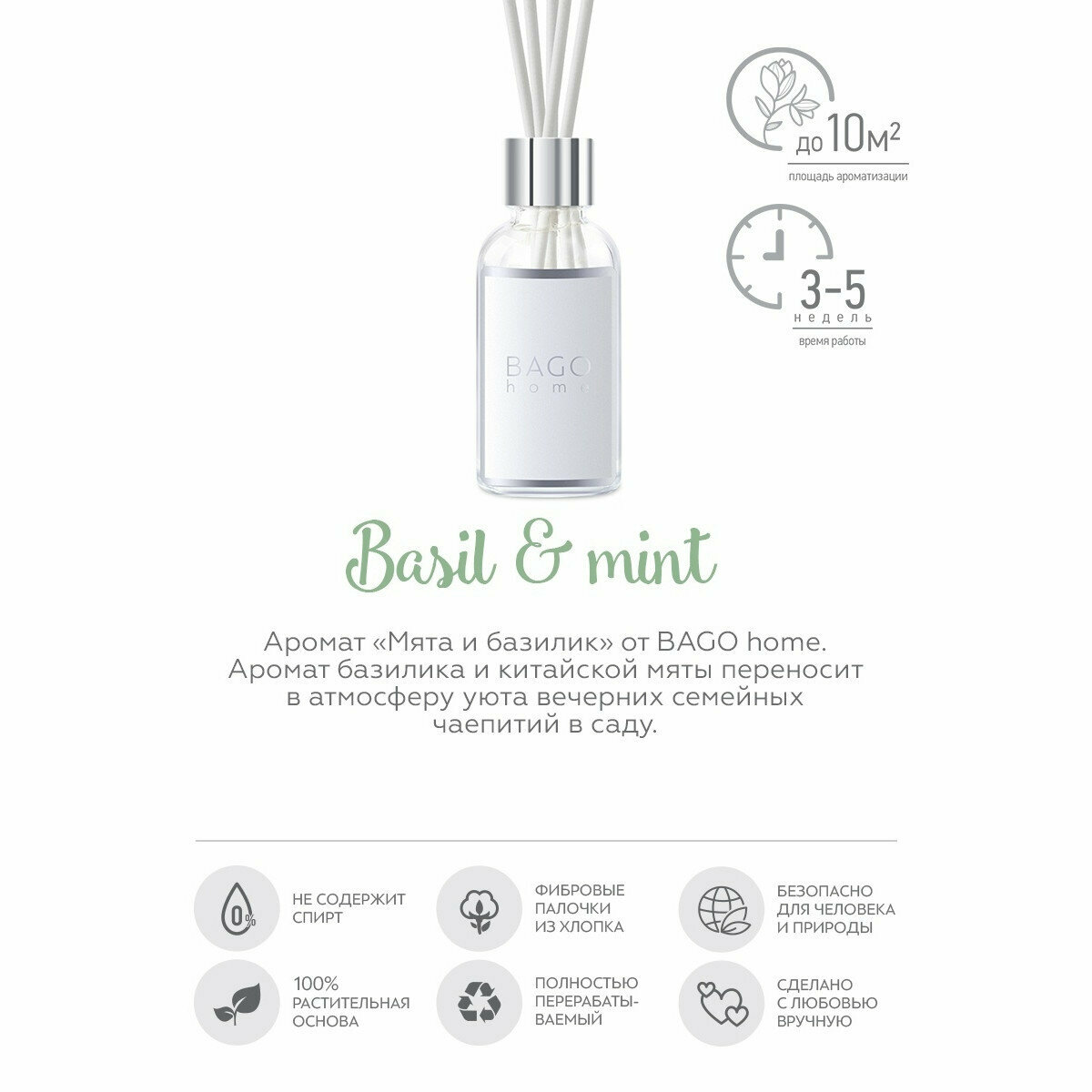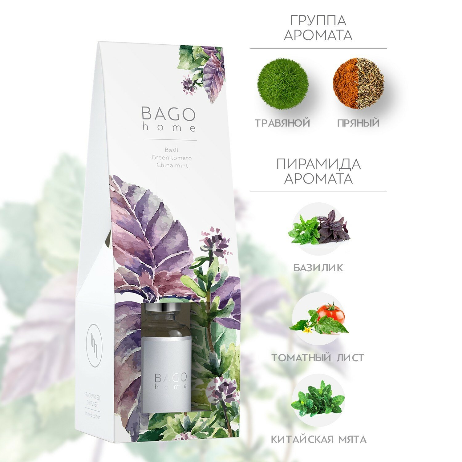 Ароматический мини-диффузор Мята и базилик 30 мл Bago home