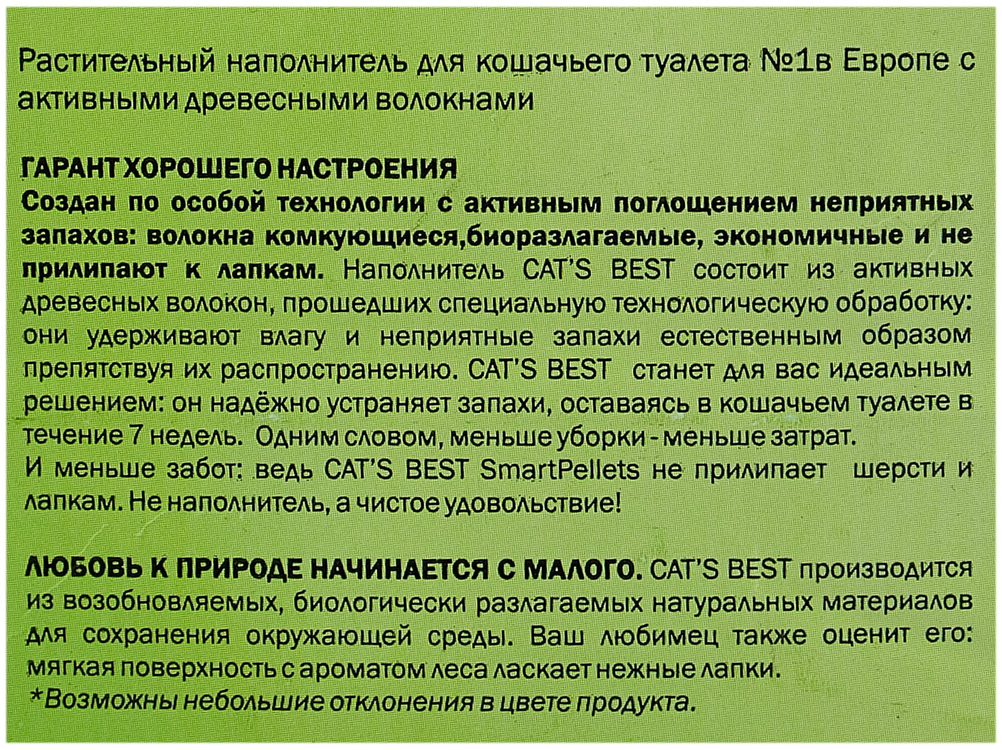 Наполнитель Cat's Best Nature Gold Древесный комкующийся. Органический комкующийся древесный наполнитель для длинношерстных кошек. Влага впитывается и запирает неприятный запах в комочки. Не цепляется за шерсть - идеально подходит для длинношерстных кошек. Не разносится из лотка. Отлично изолирует неприятный запах. Исключительные абсорбирующие качества. Эко-продукт: 100% чистые органические волокна. 100% биоразлагаемый. Не пылит. Естественная мягкость покрытия для кошачьих лап. Природные свежий запах - без добавления химических добавок или ароматизаторов, очень нравится кошкам. Легкая транспортировка. Загрязненные комочки наполнителя можно утилизировать в туалет. Мини-пеллеты CAT'S BEST Nature GOLD более тяжелые, чем гранулы CAT'S BEST OkoPlus, поэтому не прилипают даже к длинной шерсти кошек и не разносятся из лотка. Эффект комкования CAT'S BEST Nature GOLD не так ярко выражен, как у CAT'S BEST OkoPlus, из-за особой структуры пеллетов, но и при этом он идеально выполняет свои функции. То, что строго запрещается при использовании бентонитовых наполнителей, не проблема для CAT'S BEST: утилизация загрязненных комочков в обычный домашний туалет! CAT'S BEST Nature GOLD состоит из природного волокна. Именно поэтому загрязненные комочки наполнителя без проблем и последствий могут быть утилизированы в бытовой канализации, также как туалетная бумага. Однако если Вы планируете полностью обновить содержимое наполнителя, то лучше выбросить его в мусорный контейнер или на компост. Только самое лучшее для кошки: проверенное качество!