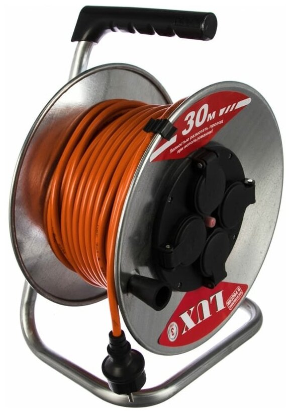 Lux Удлинитель силовой на катушке К4-Е-30 ПВС 3x1.5 16А 4 розетки з/к 30 м Предназначен для присоединения бытовых электроприборов класса защиты I и II к электрической сети переменного тока напряжением до 250 В (50Гц). Четыре встроенные розетки с З/К позволяют подключать к удлинителю электроприборы суммарной мощностью до 3500Вт при полностью размотанном кабеле и до 500Вт при намотанном на катушку кабеле. Удлинители с кабелем ПВС 3x1.5. Температурный диапазон применения удлинителей от -0°С до +40°С. Удлинитель смонтирован на металлической катушке. Корпус катушки изолирован от стойки, на которой закреплен с помощью пластмассового фланца, что не требует обязательного заземления корпуса и обеспечивает совместно с ручкой из пластиката дополнительную защиту от поражения электрическим током.