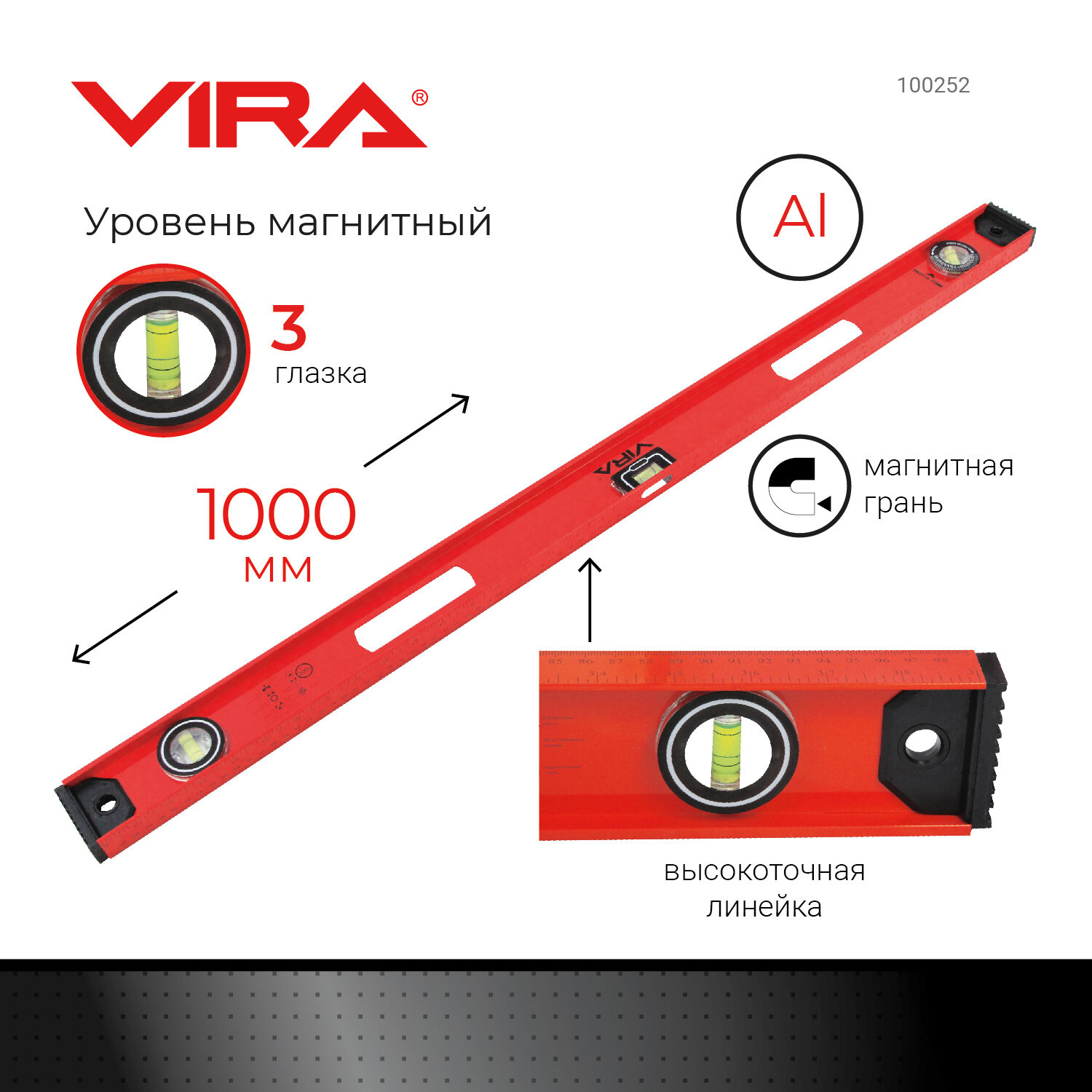 Уровень VIRA магнитный 1000мм с поворотным глазкомУровень оснащен тремя глазками, из которых один подвижный, что позволяет обнаружить отклонение поверхности от горизонтали или вертикали, и перенести определенный угол с одного замера на другой.Отличительной особенностью данного инструмента является наличие магнитной грани. Усиленная конструкция из прочного алюминия позволяет выдерживать падения с небольших высот. Корпус оснащен высокоточной линейкой, облегчающей измерительные работы. Данный уровень оптимизирован для профессионального использования, отличается вниманием к деталям и высокой точностью.