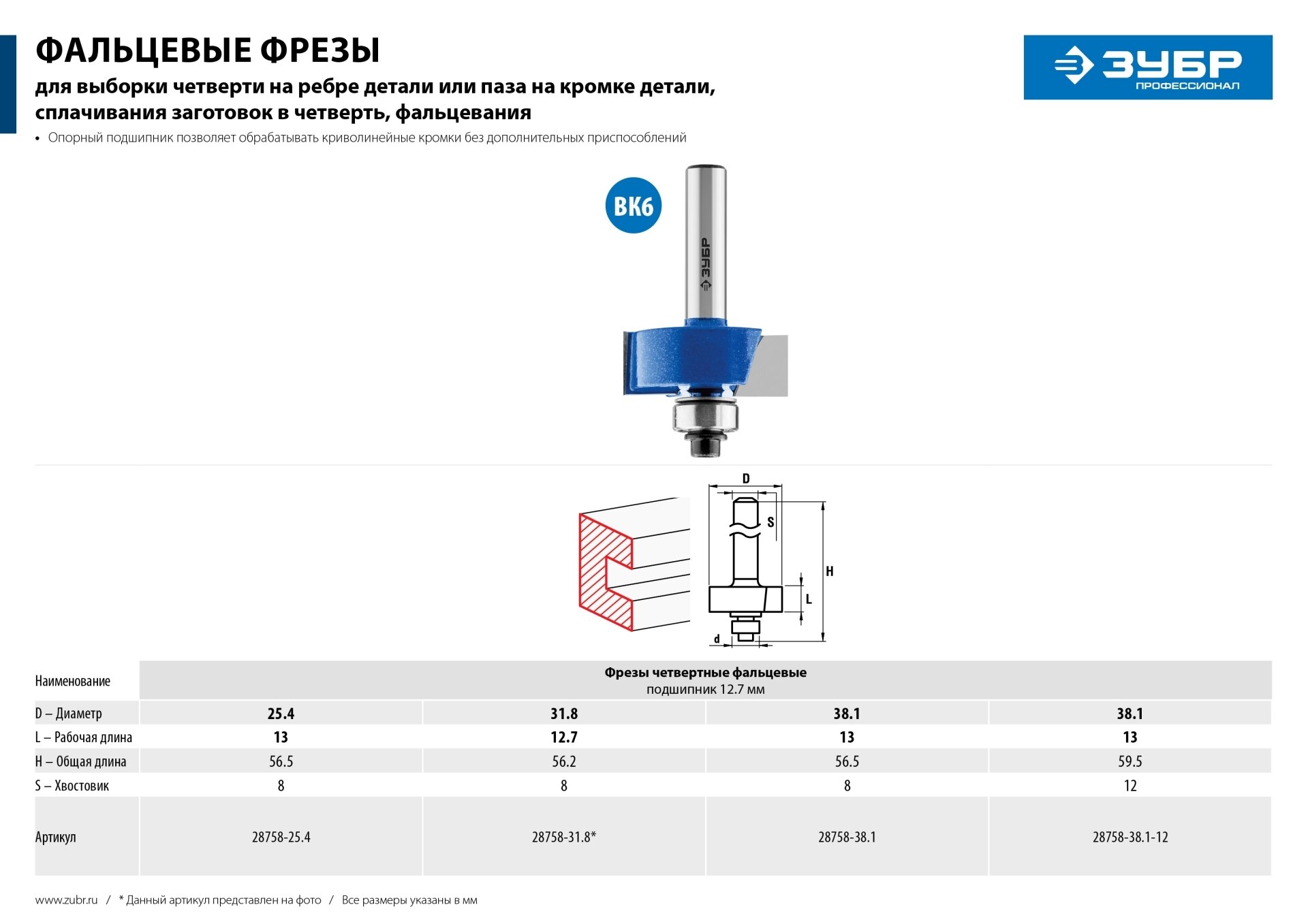 Фальцевая фреза ЗУБР 28758-38.1-12