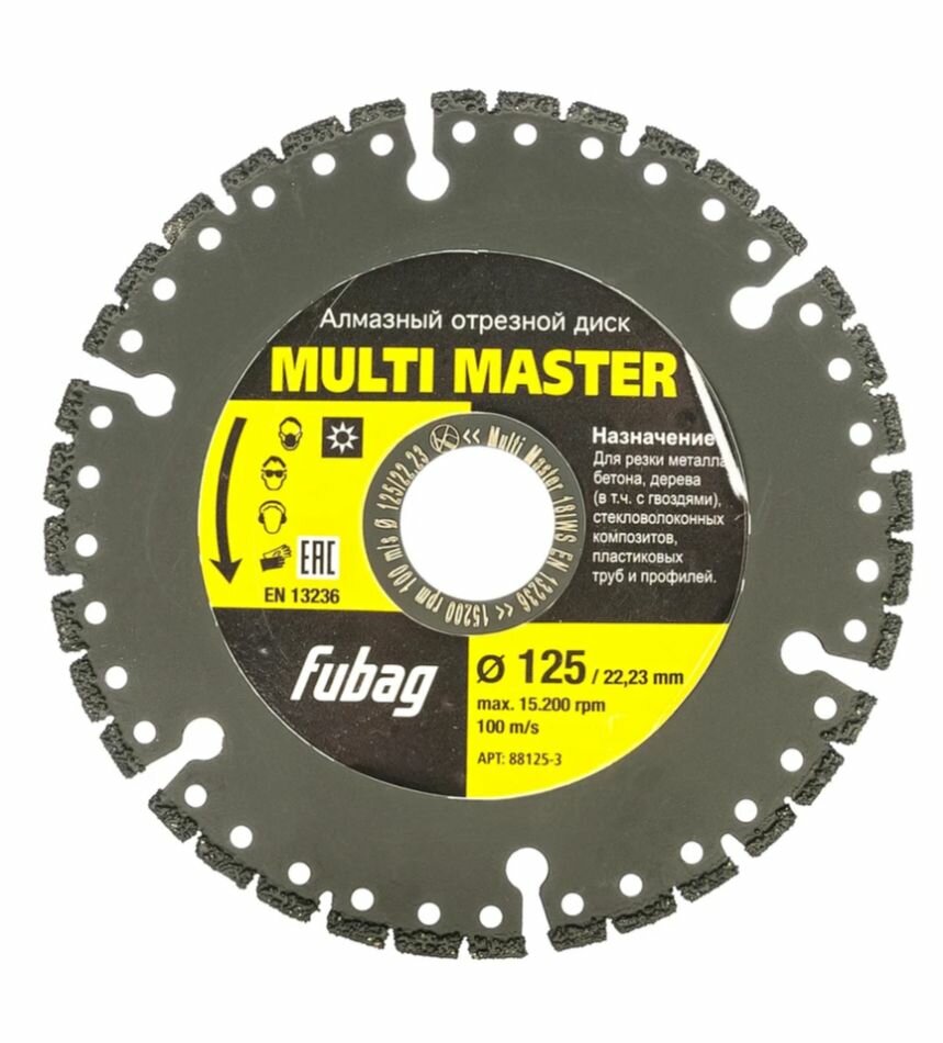 | Прочие особенности и свойства | Алмазный отрезной диск для бетона с сегментной режущей кромкой диаметром 125 мм и посадочным отверстием 22.2 мм. Рекомендован для резки такого материала как:строительные материалы:металл, бетон, дерево (в том числе, и с гвоздями), стекловолоконные композиты, пластиковые трубы и профили. |