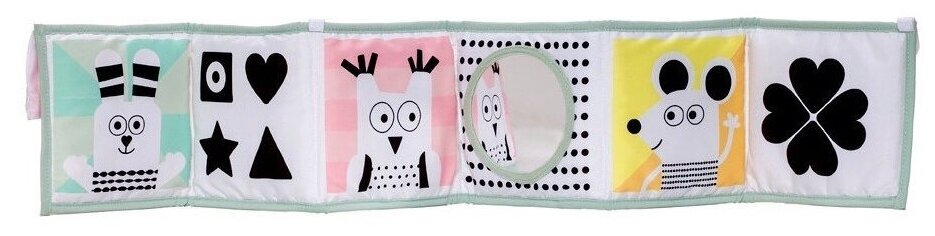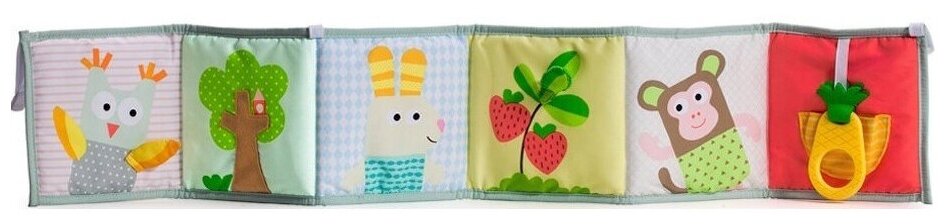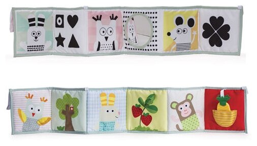 При помощи клипс книжку можно легко крепить к кроватке или коляске, стимулируя ребенка играть лежа на животе. Книжка легко складывается и может стоять самостоятельно.