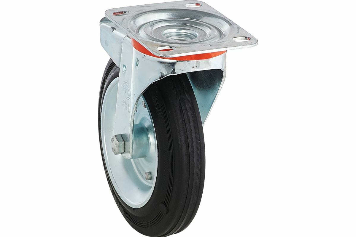 Колесо поворотное с тормозом промышленное из черной резины. Жесткость 80 шор А. Центр-сердечник состоит из двух гальванизированных дисков, соединённый прочными заклепками. Все элементы выполнены из высококачественной стали. Роликовый подшипник расположен в углублении, выдавленном под прессом, и содержит цилиндрические ролики подшипника в обойме из полиамида 6. Ступица оснащена игольчатым (роликовым) подшипником. Качественный поворотный кронштейн серии NL c двойным шарикоподшипником в основании, оснащен передним тормозом. Эта серия широко используется, с любыми тележками и контейнерами, легкой и стандартной грузоподъемности, для строительных лесов, а также для работы вне помещений. Применение: тележки для внутренних и внешних работ на складах и в промышленности, багажные тележки, для строительных лесов, контейнеры для мусора, электрооборудование. Поверхности перемещения: для полов, практически любого типа, даже вне крытых помещений. Позволяют легко преодолеть препятствия, не наносят урон хрупким напольным покрытиям. Температурный диапазон эксплуатации от -20 до +60С.