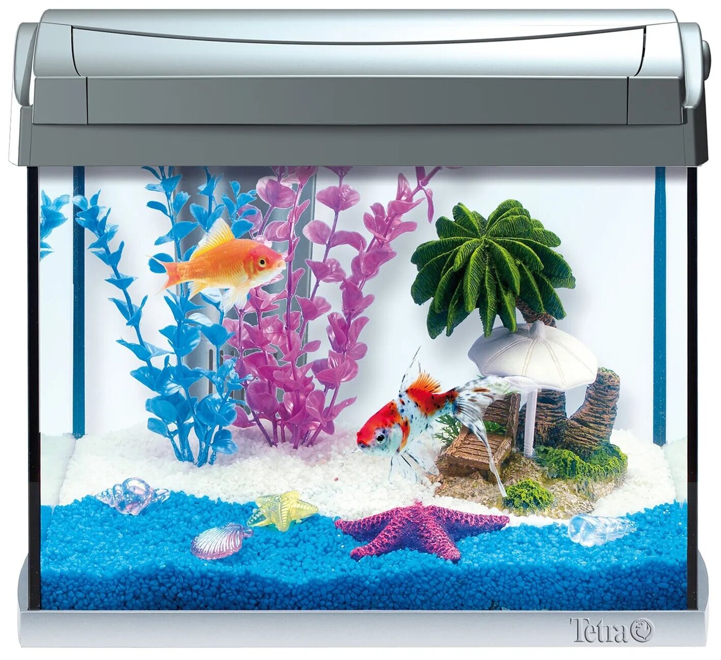Аквариум для рыб, креветок, ракообразных Tetra на 20 л серого цвета – небольшой резервуар для домашнего разведения маленьких обитателей речного или морского дна. Благодаря своим размерам легко устанавливается на любой стол или специальную подставку. Может стать начальным инструментом неопытного аквариумиста, либо отличным подарком ребёнку. Благодаря приятной подсветке выступает в роли эффектного ночника, демонстрируя всю красоту происходящего внутри в любое время суток.
