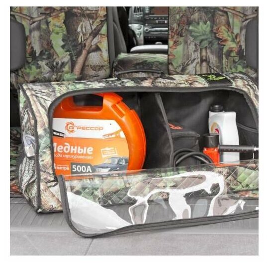 Органайзер в багажник "Зверобой", 70x30x30 см, прозрачный клапан, брезентовая ткань, вставки из экокожи, расцветка "летний камуфляж".