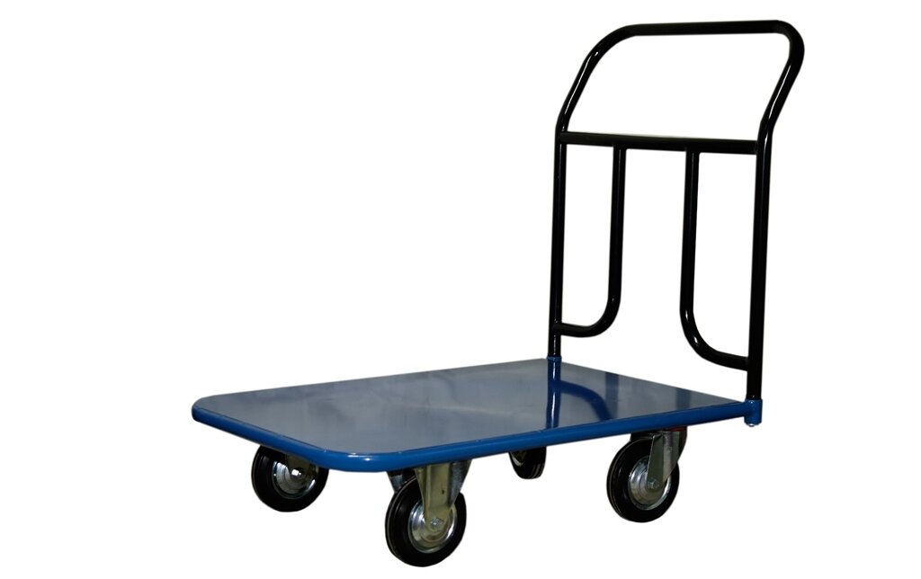 Платформенная 4-х колесная тележка КП-300-125-И используется для перемещения различных грузов в складских помещениях. Ручка крепится к платформе болтами, для компактного хранения можно снять, высота ручки 750мм. Платформа имеет уникальную рельефную, полимерную, противоскользящую поверхность, размером 600х900мм. Цвет - синий, шагрень. Тележка комплектуется: метизами для крепления, двумя поворотными и двумя неповоротными промышленными колесами, диаметром 125мм., из черной стандартной резины, от всемирно известного, ведущего итальянского производителя Tellure Rota. Грузоподъемность до 390кг.