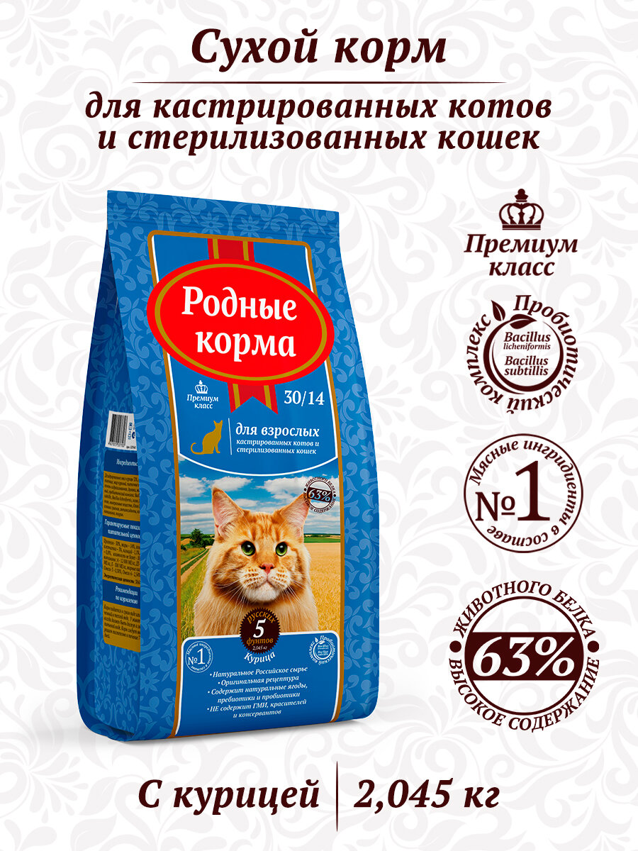 Сухой полнорационный корм премиум-класса для взрослых стерилизованных кошек и кастрированный котов Родные корма. Изготовлен с учетом их физиологических потребностей. В составе только натуральное российское сырье без ГМО, красителей и консервантов.
