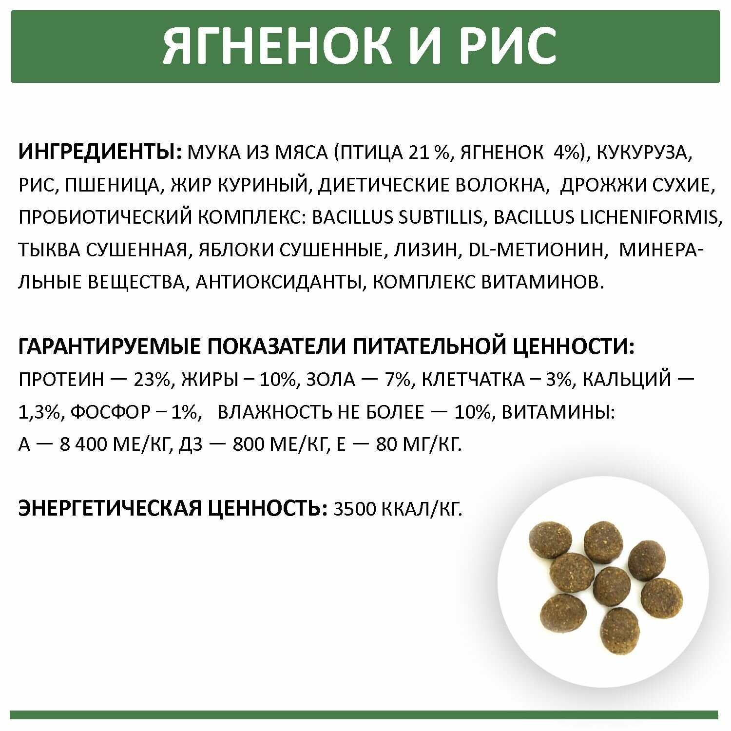 | Состав | Состав: мука из мяса (птица 21 %, ягненок 4%,) , кукуруза, рис, пшеница, жир куриный, диетические волокна, дрожжи сухие, пробиотический комплекс: Bacillus subtillis, Bacillus licheniformis, тыква сушенная, яблоки сушенные, лизин, DL-метионин, минеральные вещества, антиоксиданты, комплекс витаминов |