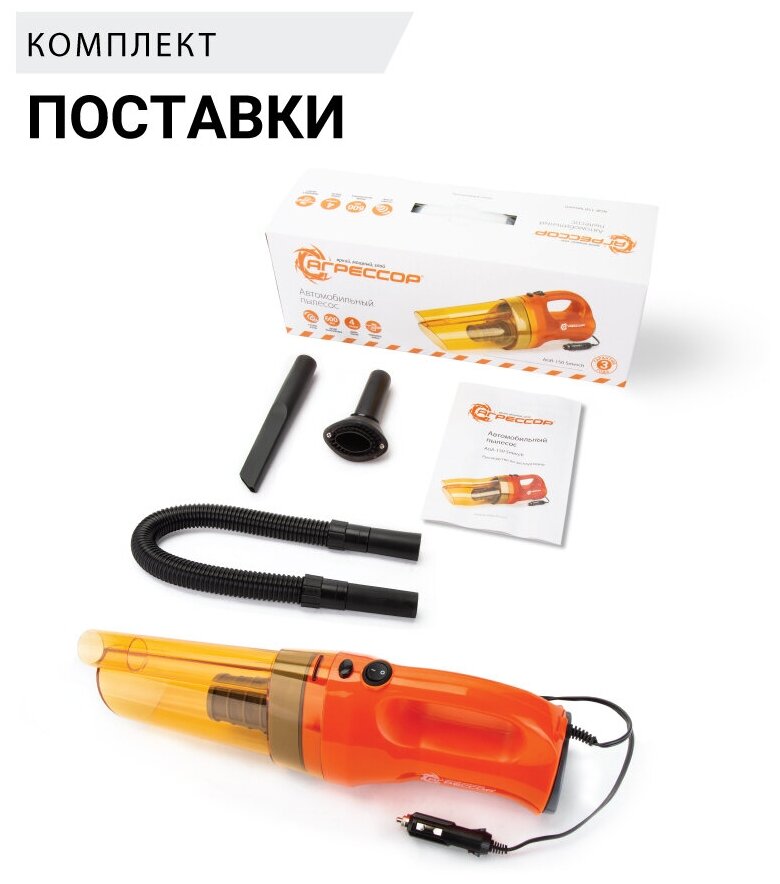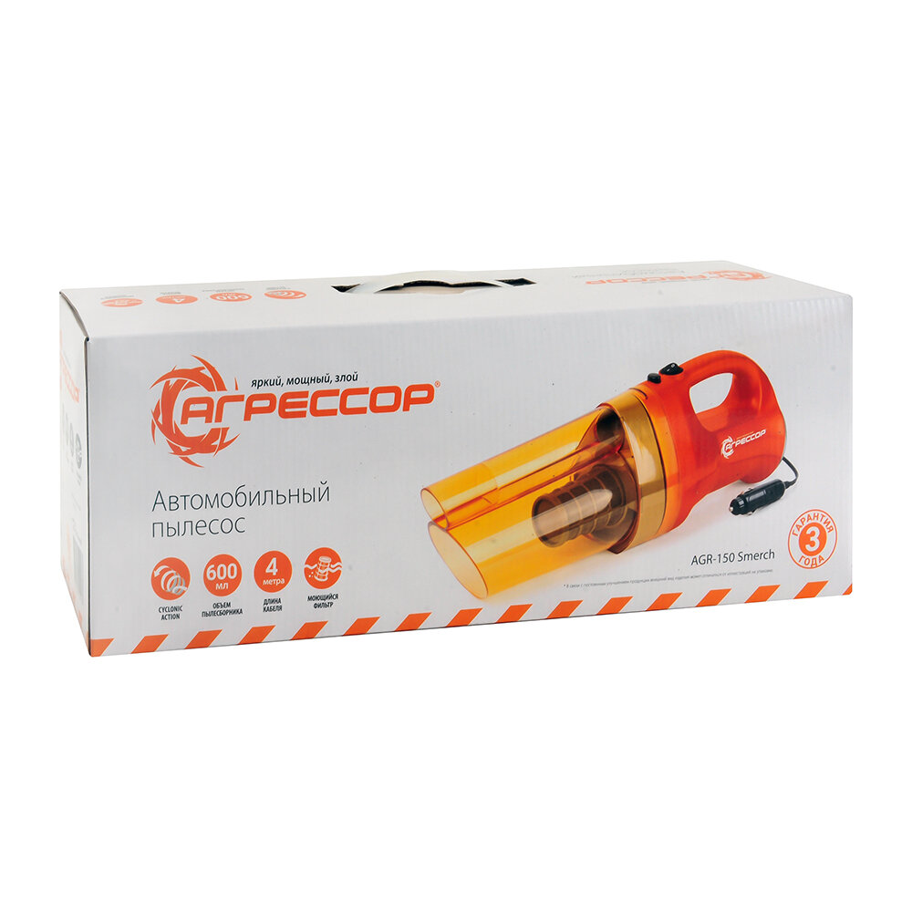Компактный и мощный пылесос Агрессор без мешка для сбора пыли, с технологией фильтрации Смерч, длинный кабель, питание от бортовой сети автомобиля, а также пять насадок входящие в комплект, обеспечат деликатную и тщательную сухую уборку салона автомобиля.