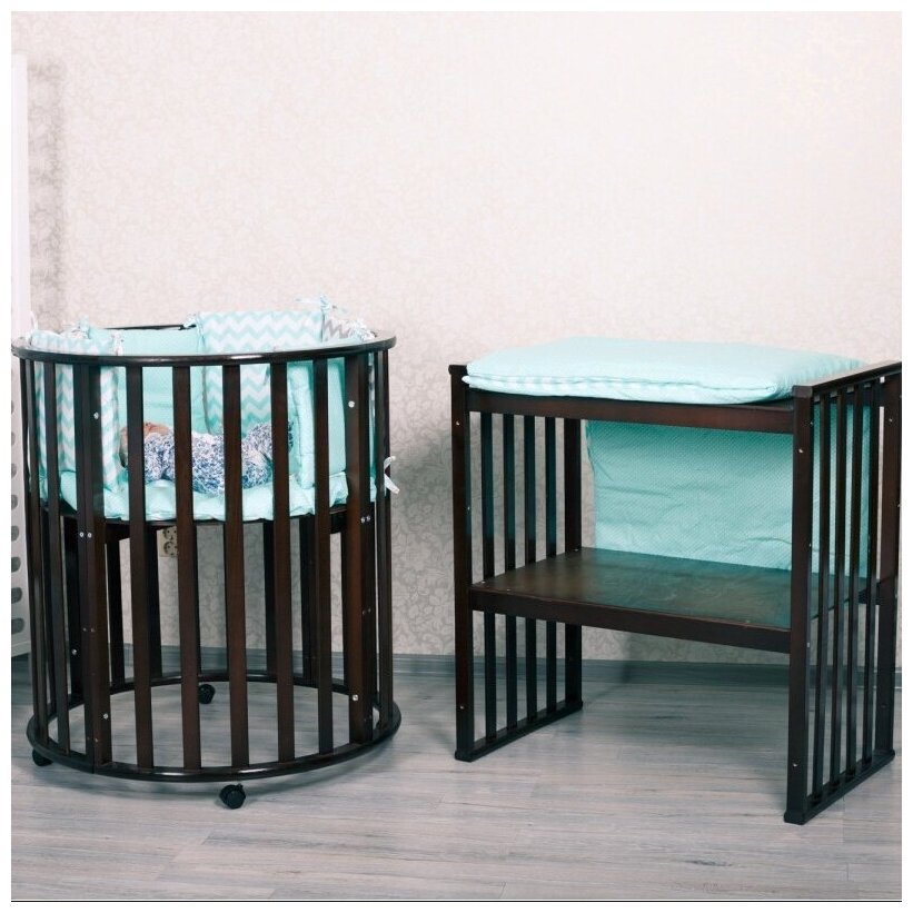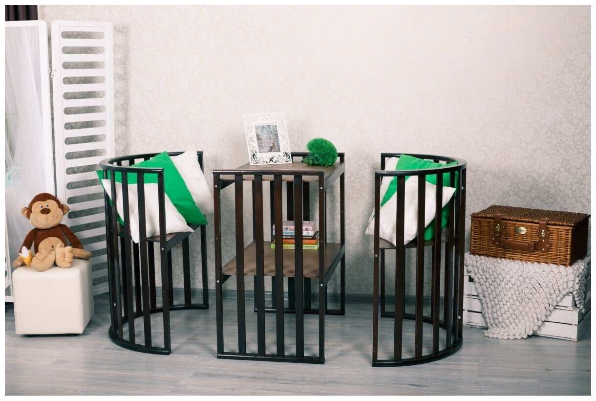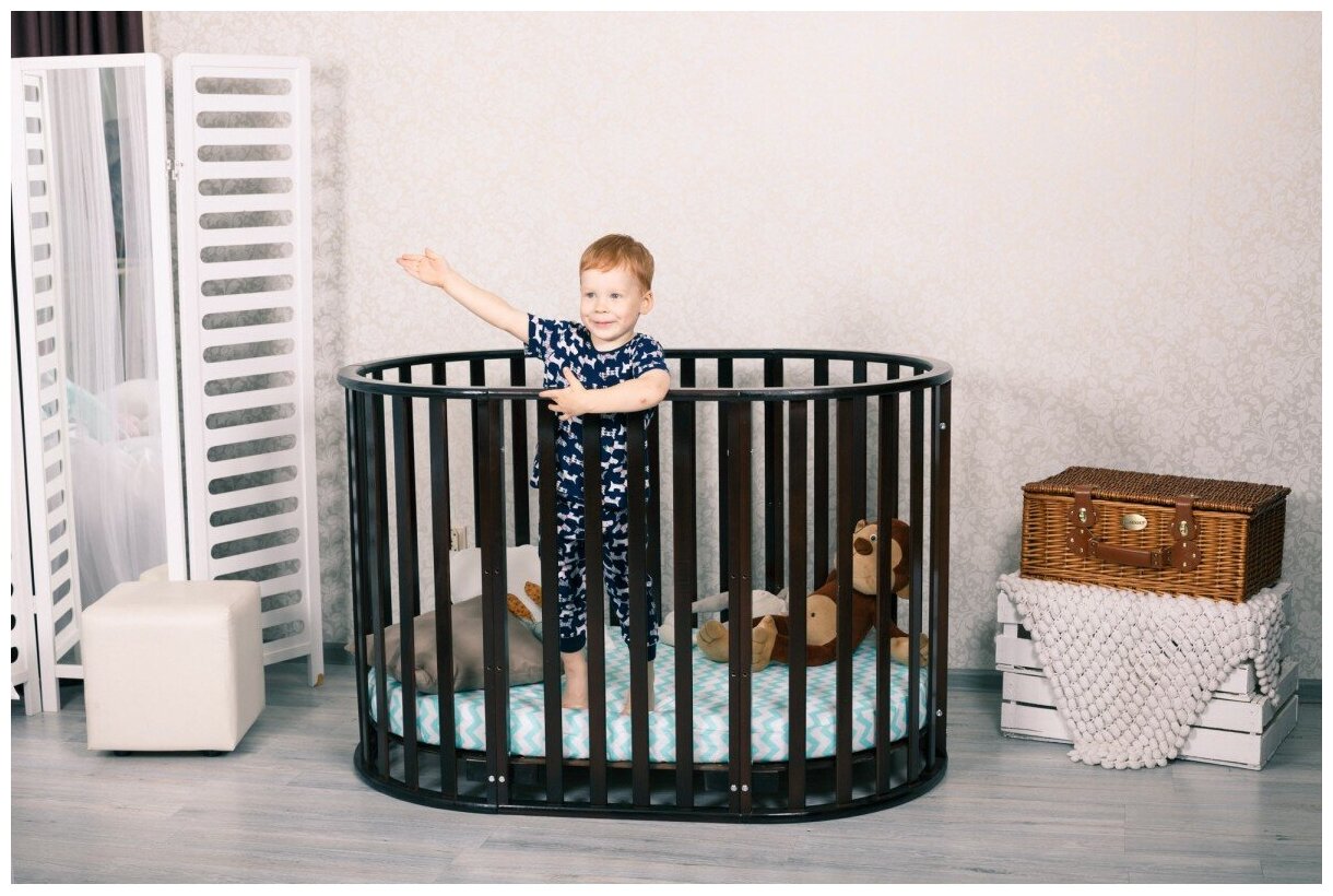 Экологичная и безопасная детская кроватка-трансформер для детей от рождения до 5 лет. Изготовлена из массива берёзы. Трансформирование происходит из круглой кроватки для новорожденных детей до шести месяцев в овальную до 5 лет. Затем в столик и два стульчика. У данной модели высокое качество обработки массива берёзы, а также высококачественные лаки и краски на водной основе. Кроватка оборудована тремя уровнями спального ложа и колёсами, что позволит легко перемещать её в комнатном пространстве. Ложе ортопедическое с вентиляцией. Для новорожденного крохи используется круглая кроватка размером 75*75 см с широкими рейками на безопасном расстоянии. Расстояние между рейками оптимальное при котором ручки и ножки Вашего малыша не будут застревать. Компактные внутренние размеры люльки идеально подходят для младенца напоминая крохе мамин животик.