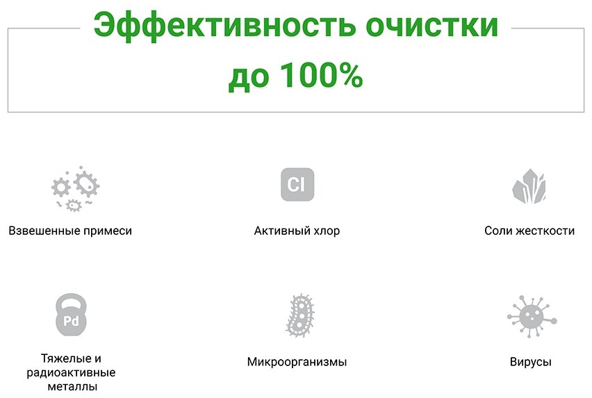 | Очистка воды | активный хлор, бактерии, тяжелые металлы, соли, ржавчина, запахи, вкус, органические примеси |