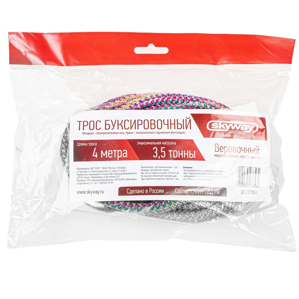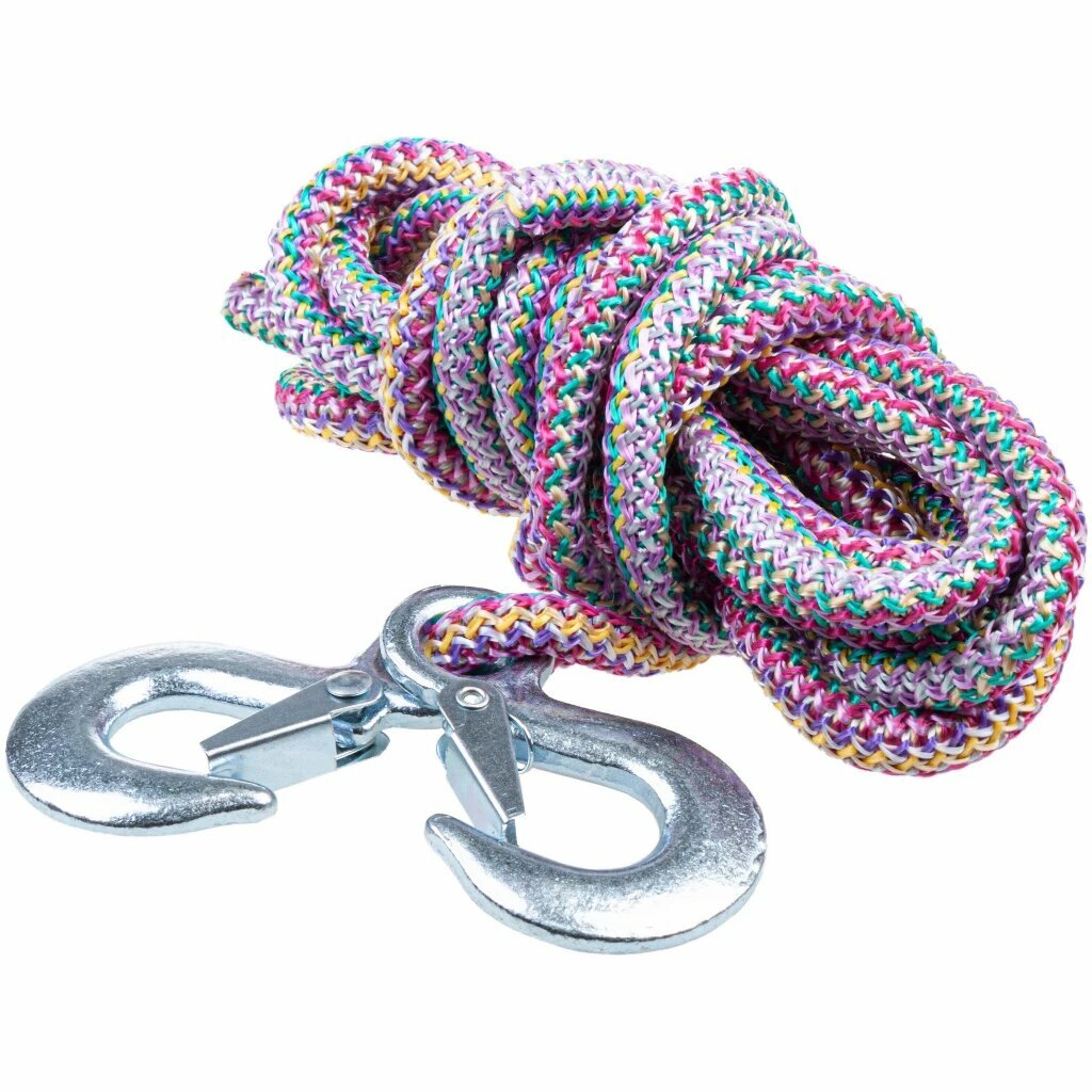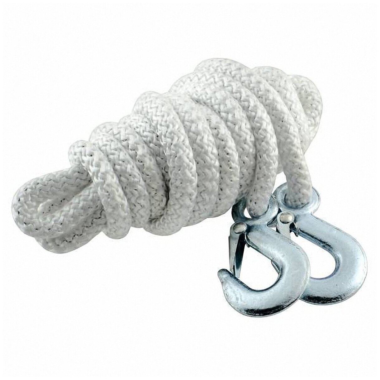 Сверхпрочный веревочный трос, который изготовлен из прочной полипропиленовой нити с усилием на разрыв, превышающим нормы. Крюки металлические с фиксатором обеспечивают надежный захват. Веревочный трос устойчив к очень низким и высоким температурам и может использоваться в любых погодных условиях.