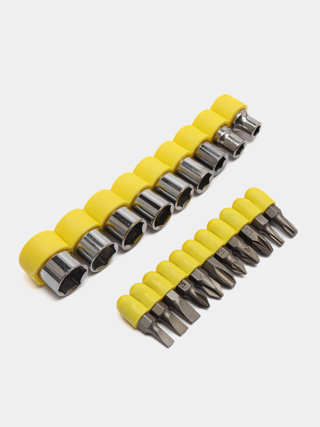 Хром-ванадиевая сталь повышенной твердости. Т-образная пластмассовая ручка с отделением для хранения бит. Набор из 21 предмета: - торцевые головки Cr-V - 5, 6, 7, 8, 9, 10, 11, 12, 13 мм - биты из хром-ванадиевой стали: плоский шлиц 3, 4, 5, 6 мм; крестовой шлиц #1, #2, #3; крестовой шлиц Pozi #1, #2, #3 - переходник для торцевых головок.