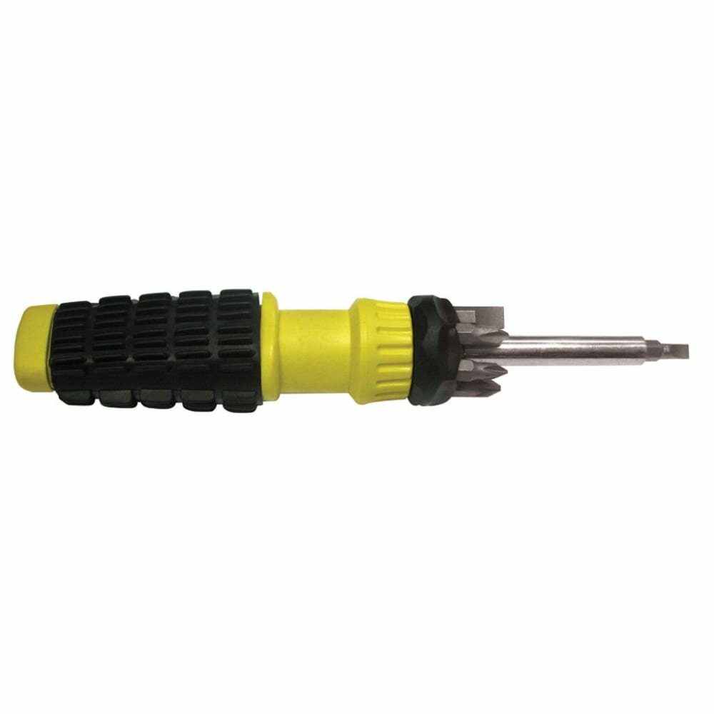Углеродистая сталь. Обрезиненная двухкомпонентная ручка. Магнитный держатель бит. Комплектуется магазином для удобного хранения бит. Биты из хром-ванадиевой стали: плоский шлиц 4 и 6 мм, крестовой шлиц #1, #2, крестовой шлиц Pozi #1, #2.