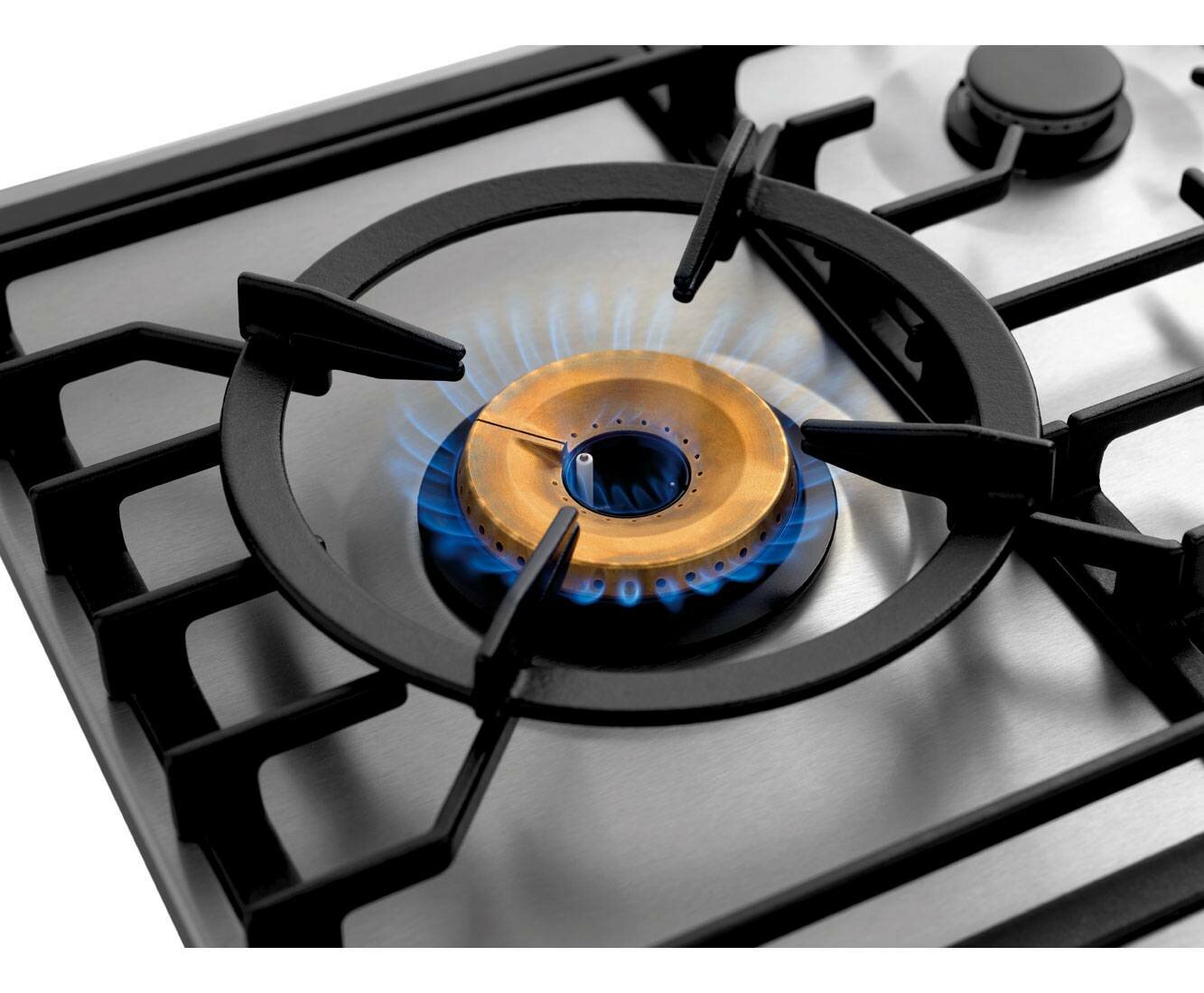 Газовая варочная панель располагает пятью высокоэффективными конфорками различной конфигурации. Конфорка Super Vario Wok имеет отверстия под косым углом. Это не только обеспечивает высокую мощность, но и способствует равномерному распределению тепла. На крышки конфорок нанесено специальное покрытие с грязеотталкивающим и термостойким свойством. Металлизированные ручки не нагреваются во время работы прибора, что создает дополнительный комфорт использования.