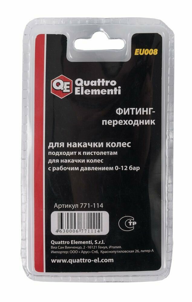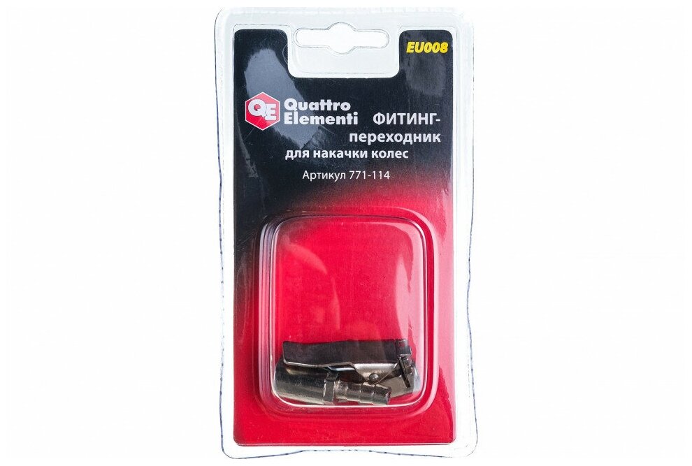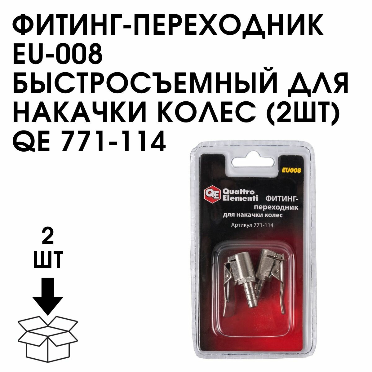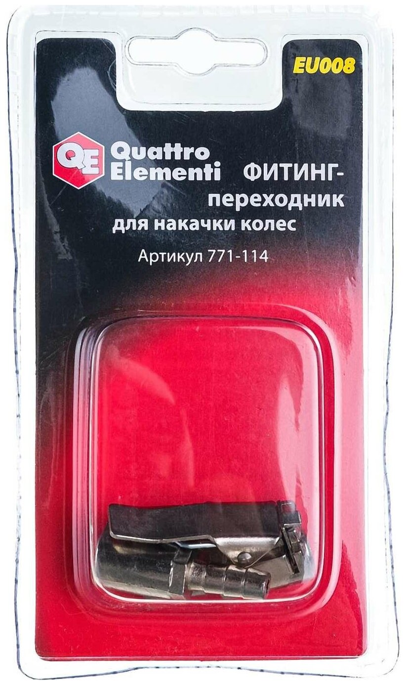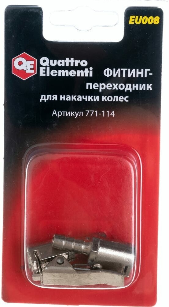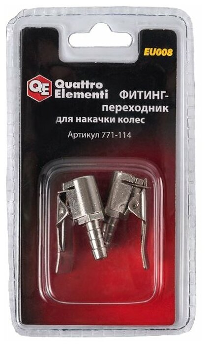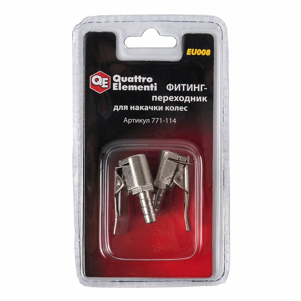 Фитинг-переходник Quattro Elementi EU-008 - комплект из 2-х фитингов-переходников для компрессорного оборудования. Применяются для подкачки колес при помощи пневматических пистолетов для накачки колес с рабочим давлением 12 бар. В блистер-упаковке 2 шт.