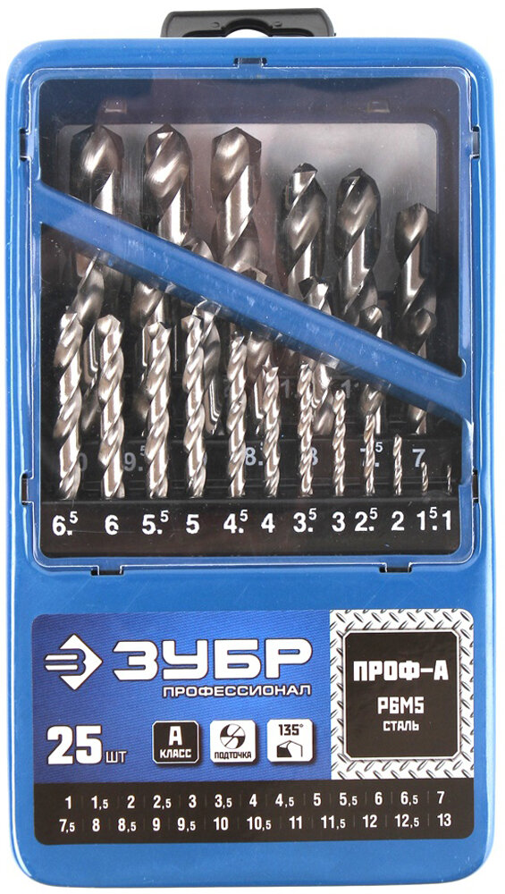 Набор сверл по металлу ЗУБР 25шт d=1-13мм Проф-А класс А сталь Р6М5