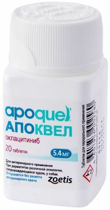 Zoetis Апоквел 5.4 мг, 20 таб – единственный препарат, разрывающий цикл зуда и воспаления при дерматите у собак. Селективный ингибитор янус-киназы (JAK) для снятия зуда у собак.Действие в течение 4 часов после введения.Хорошо переносится животными.Подходит для купирования острых и хронических состояний. Апоквел назначают собакам при дерматите, вызванным аллергией (блошиной, контактной, пищевой, паразитарной), и при атопическом дерматите для устранения зуда и уменьшения воспаления. Не допускается применение препарата собакам, с признаками иммуносупрессии, такими как гиперадренокортицизм, а также собакам, с прогрессирующими злокачественными новообразованиями.