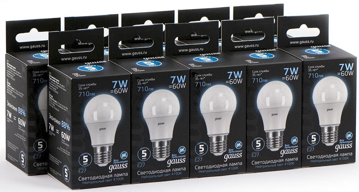 Gauss Лампа светодиодная Е27 150-265В 7Вт 4100К Светодиодная лампа - это современная альтернатива традиционной лампы накаливания. От обычной энергосберегающей лампы лампу этого типа отличает отсутствие ртути, что повышает ее экологическую безопасность и облегчает процедуру утилизации. Выгорание обивки мебели, краски и прочего не происходит за счет того, что светодиодная лампа не дает УФ-излучения, а высокая устойчивость к ударам позволяет использовать ее даже для уличного освещения.