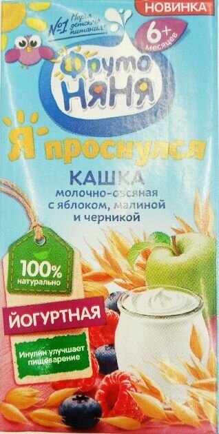 | Состав | Молоко сухое цельное, мука овсяная, концентрированный яблочный сок, йогурт сухой обезжиренный, мальтодекстрин, пюре яблочное, молоко сухое обезжиренное, пребиотик – инулин, пюре черничное, пюре малиновое, ароматизатор натуральный «Малина», ароматизатор натуральный «Черника», вода. Содержит сахара природного происхождения. |