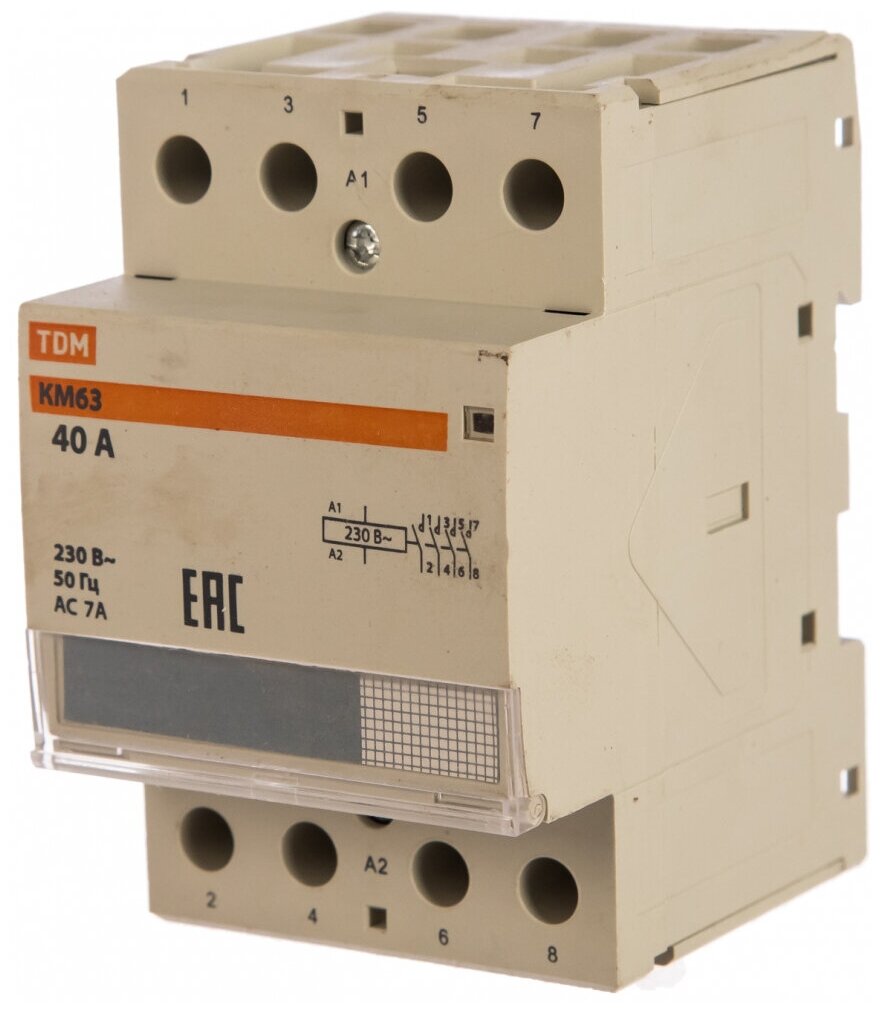 TDM Контактор мод. 40А 4NO 230В AC КМ63/4-40Модульные контакторы серии КМ63. Коммутация слабоиндуктивных нагрузок с номинальным током до 63 А. Используются для автоматизации и управления различных технологических процессов, в том числе в системах освещения, кондиционирования, вентиляции и т. д.