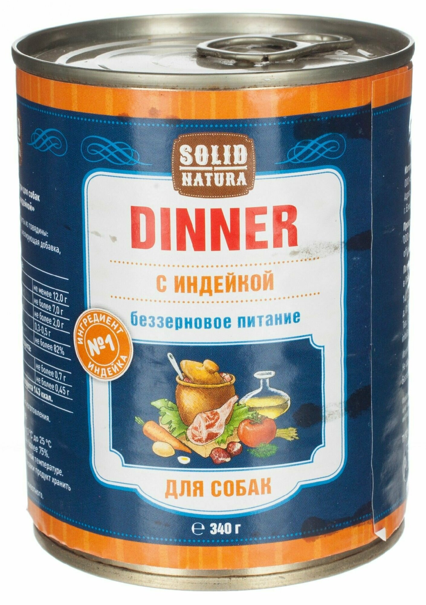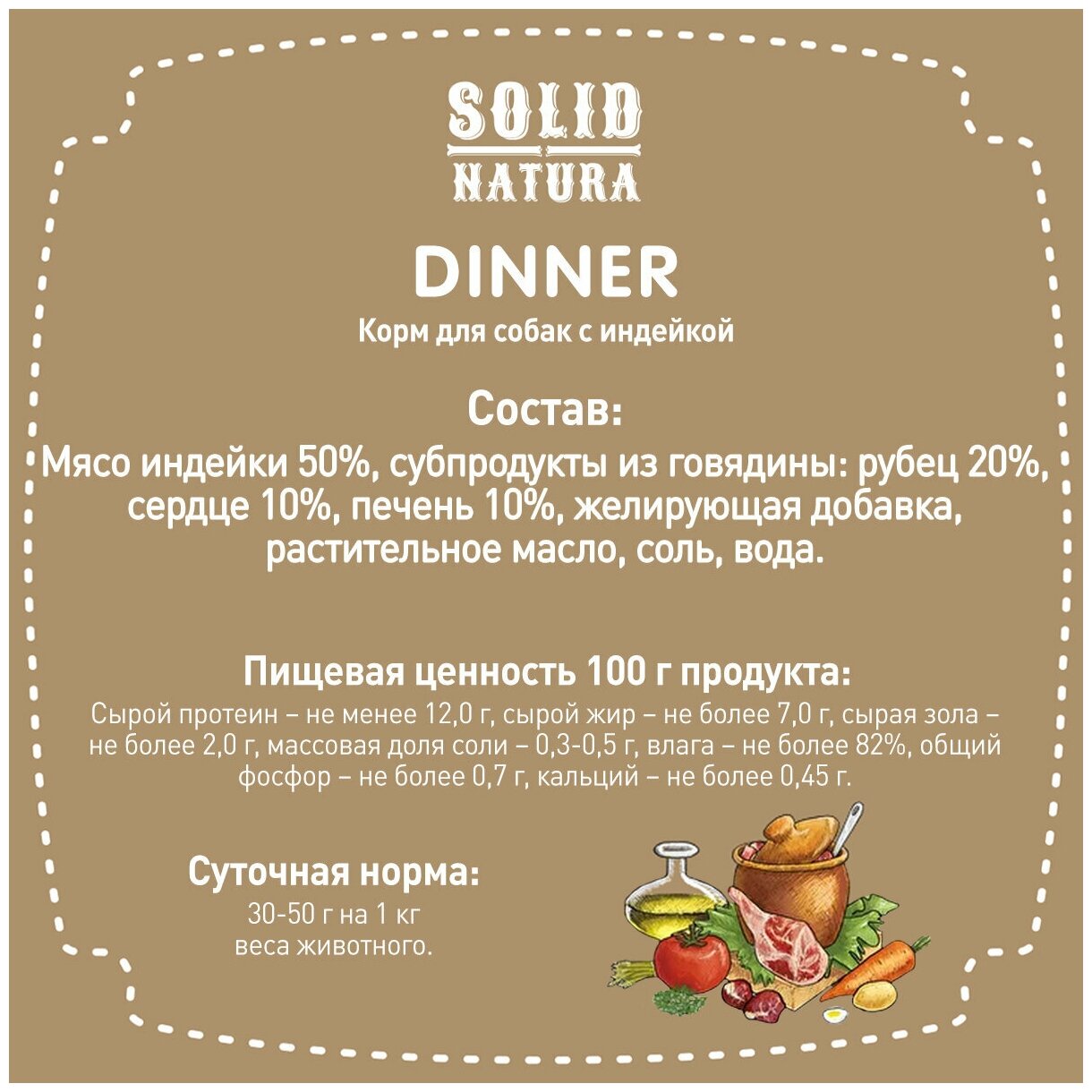 Solid Natura Dinner с индейкой - консервированное влажное питание класса премиум для собак. Нежная консистенция в виде фарша, отличная поедаемость, в составе отсутствуют зерновые культуры.