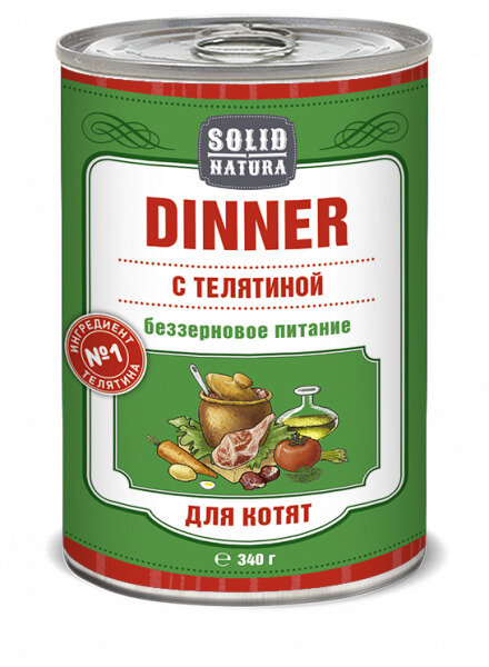 Solid Natura Dinner с телятиной - консервированное влажное питание класса премиум для котят. Нежная консистенция в виде фарша, отличная поедаемость, в составе отсутствуют зерновые культуры.