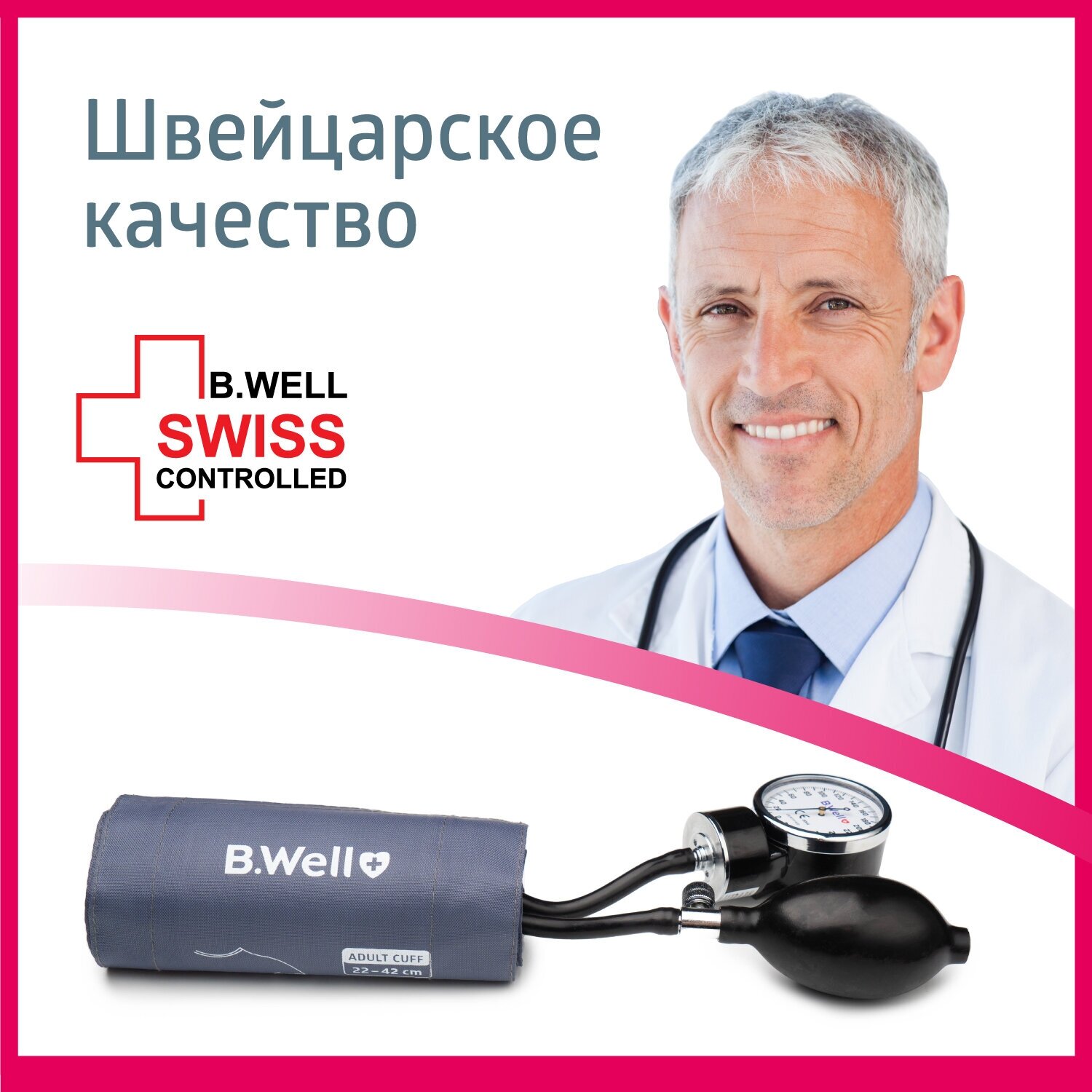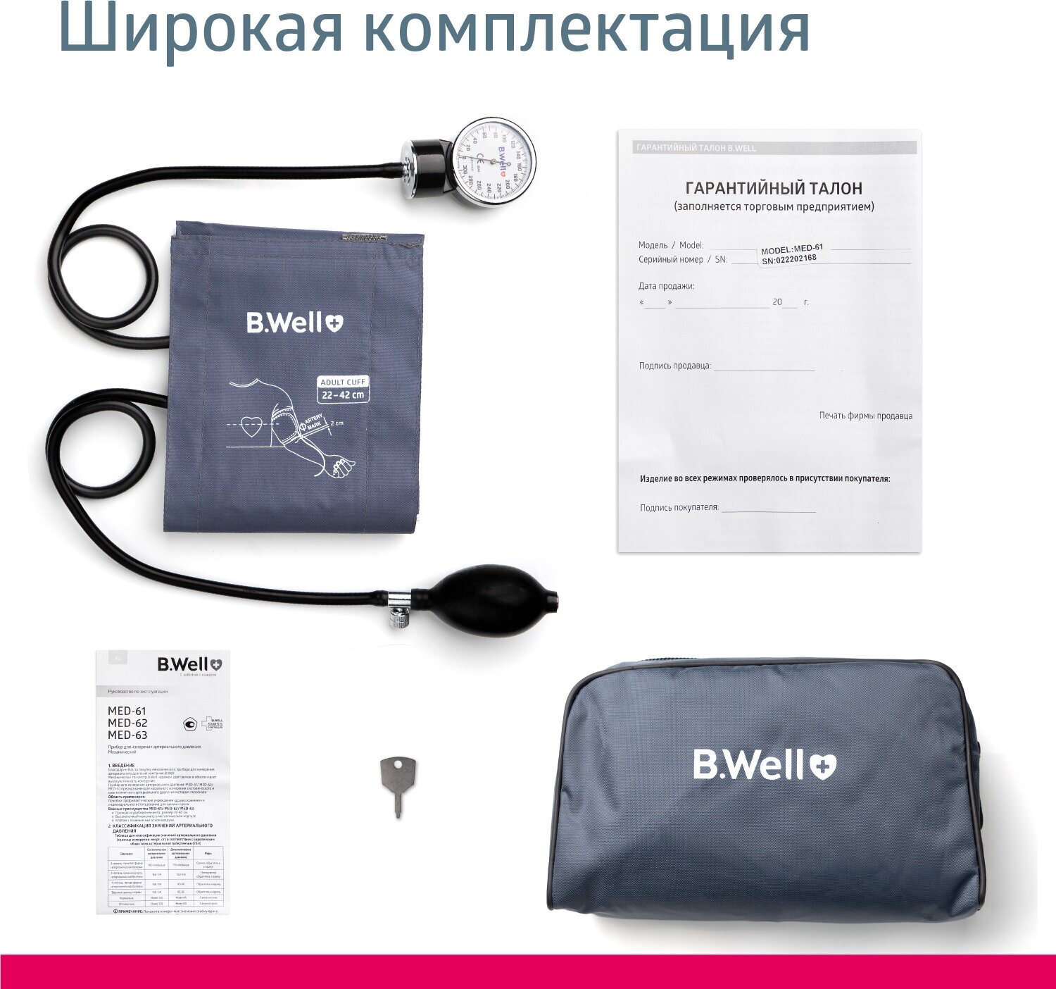| Универсальный размер для обхвата руки 22 42 см подойдет для людей разной комплекции. Манжета B.Well долговечна и комфортна | выполнена из прочного нейлона, имеет увеличенную застежка велкро. |