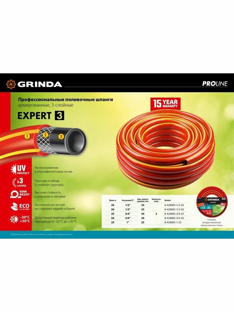 | Доп. наименование Водопад | Поливочный шланг Grinda PROLine Expert 3 8-429005-3/4-25_z02 3/4", 25 м, 30 атм, трёхслойный, армированный |