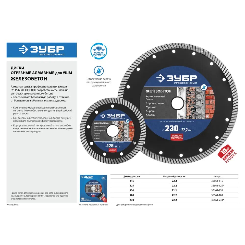 Исключительно высокий уровень качества отрезных алмазных дисков ЗУБР гарантирован комплексной системой контроля всего процесса производства: от качества поступающего сырья до готовой продукции. Корпуса алмазных дисков изготовлены из прочной легированной стали, способной выдержать значительную механическую нагрузку и высокую температуру.ПреимуществаСпециально подобранные компоненты металлической связки позволяют осуществлять резку армированного бетона.Оригинальная сегментированная форма режущей кромки позволяет быстро и эффективно осуществлять необходимые резы в обрабатываемом материале.Высококачественные синтетические алмазыВысота режущей кромки в 10 мм гарантирует продолжительный рабочий ресурс диска при работе даже с самыми сложными в обработке материалами.Высокая скорость реза и увеличенный рабочий ресурс круга обеспечиваются особой технологией горячего спекания.Минимизация бокового трения благодаря сегментированной форме режущей кромки.Эффективная работа без принудительного охлаждения.ИспользованиеРезка армированного бетона, бордюрного камня, кирпича, тротуарной плитки, керамогранита и других строительных материалов без принудительного охлаждения. Применяется на УШМ.