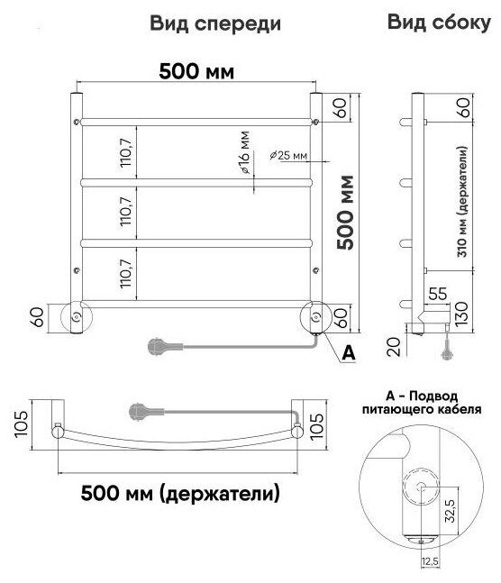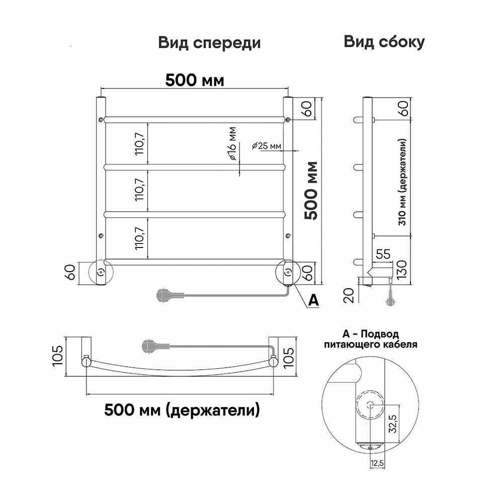 Полотенцесушитель электрический Indigo Arc 500х500, провод справа, хром