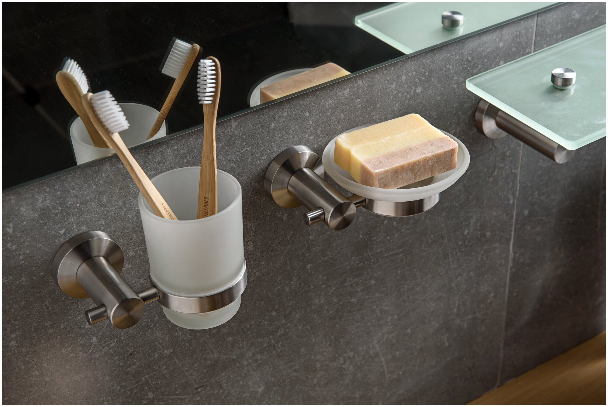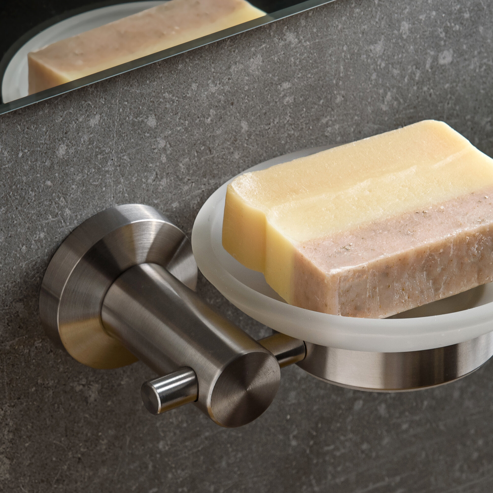Мыльница из коллекции Force предназначена для кускового мыла. Она отличается элегантным держателем, а также настенным типом крепления. Емкость, в которой располагается мыло, изготовлена из прочного матового стекла. Все остальные элементы выполнены из нержавеющей стали высокого качества.