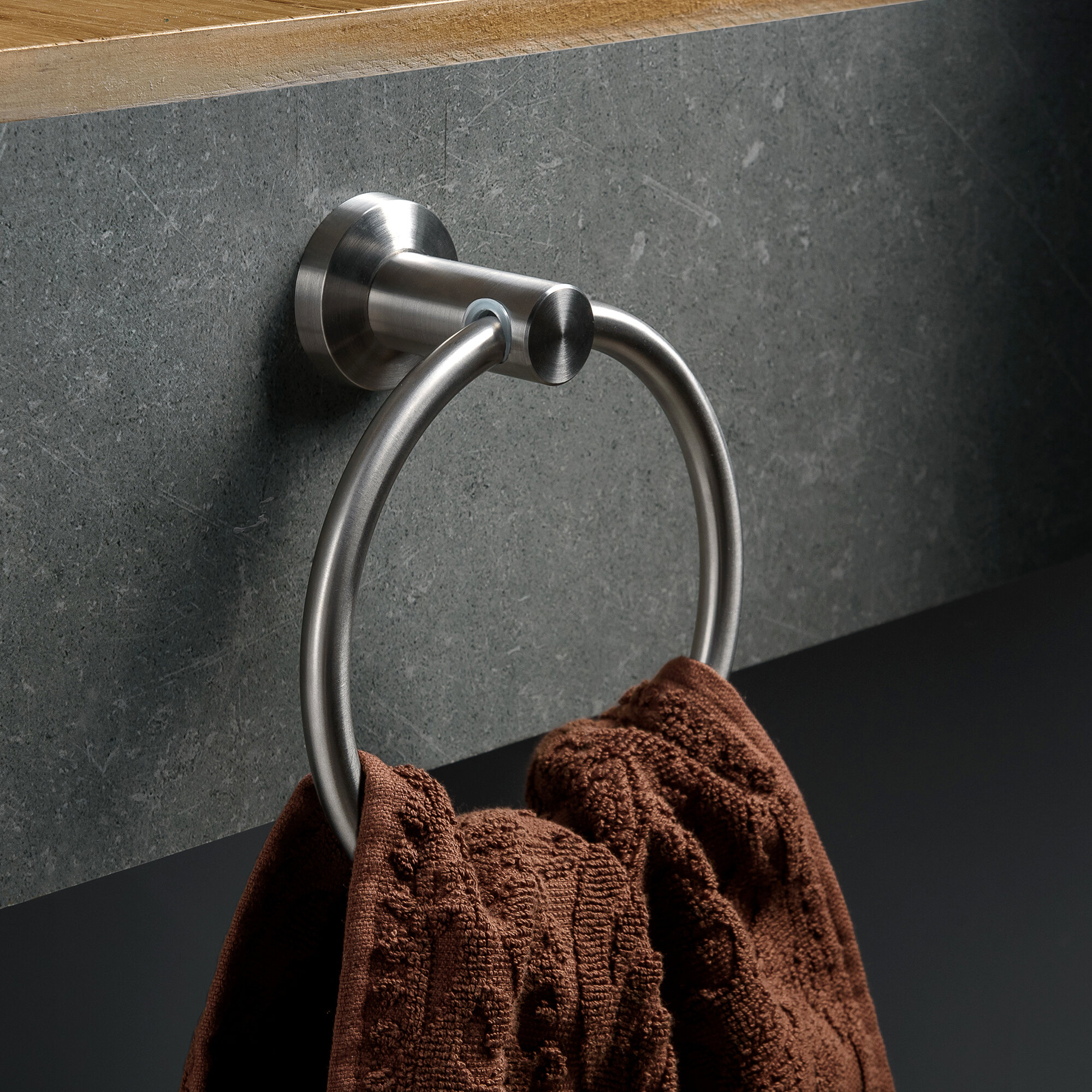 Настенный держатель для полотенца из коллекции Force выполнен в форме кольца. Он оснащен настенным типом крепления, благодаря чему держатель можно легко разместить возле раковины. Изготовлен аксессуар из нержавеющей стали. Он имеет текстурное матовое покрытие. В таком кольце можно разместить одно небольшое полотенце.