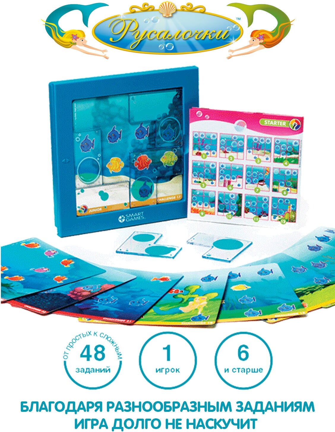 В подводном царстве все чаще стали появляться хищные рыбы! Русалочки защищают своих рыбок. Чтобы хищная рыба не съела других, нужно поместить ее в воздушный пузырь, который унесет ее подальше! Логическая игра Русалочки увлечет маленьких любителей подводного царства. Игра содержит 48 заданий, четыре уровня сложности. Для того, чтобы начать игру, нужно выбрать задание, положить его на игровое поле и начать закрывать хищных рыб пузырями. Но не все так просто! В вашем распоряжении будет шесть пластиковых пластин, на которых и нарисованы пузыри, но пластины разной формы. Нужно будет хорошо подумать, чтобы спасти рыбок! Эта логическая головоломка развивает логическое мышление, зрительное и пространственное восприятие. Игра Русалочки отлично подойдет для маленьких любителей головоломок и их родителей. Все элементы игры сложены в компактную пластмассовую коробку. Закрывающаяся крышка служит так же игровым полем. В набор входит: книга (с заданиями и ответами), и шесть пазлов для игры.