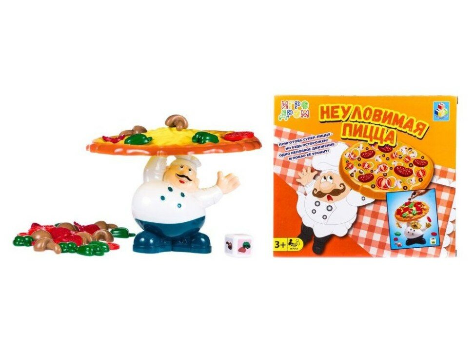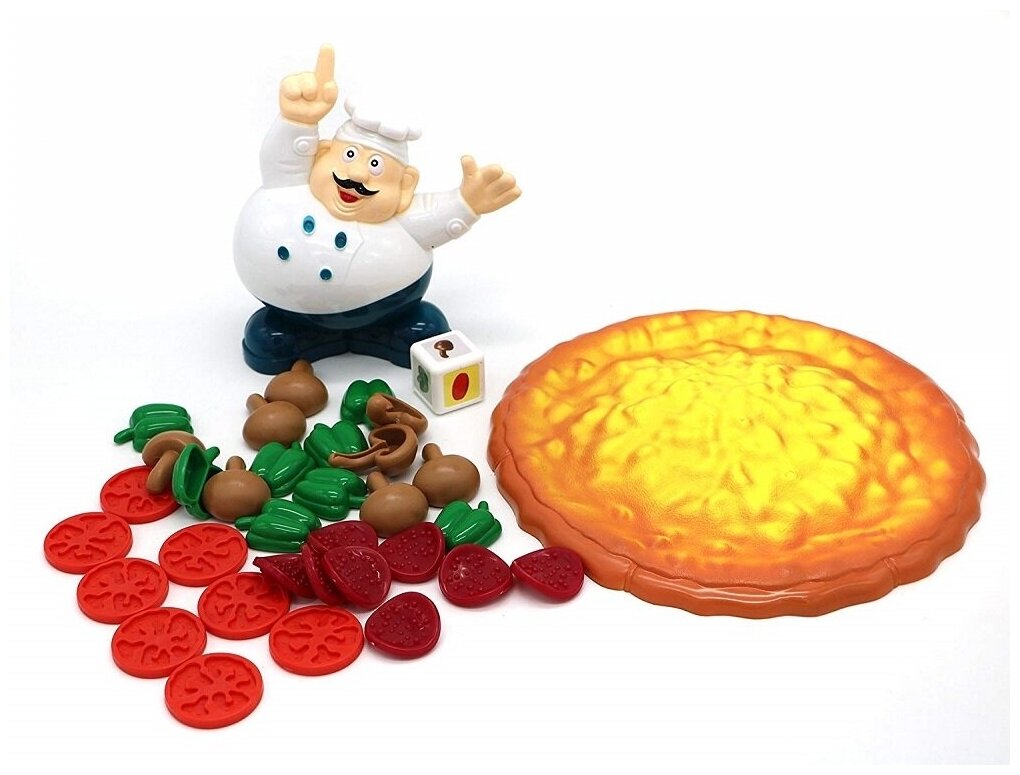 По правилам этой настольной игры ее участники должны приготовить аппетитную пиццу, но начинку определяет бросок кубика. Выпавший ломтик колбаски, грибочек или помидор игрок размещает на основе, но фигурка повара неустойчивая, поэтому пирог может упасть. Победителем станет участник, сумевший доготовить до конца пиццу и не уронить при этом ингредиенты. Настольная игра станет прекрасной тренировкой координации движений и мелкой моторики рук детей, а также разнообразит их досуг. Настольная игра надолго задержится в коллекции вашего ребенка, так как ее составляющие изготовлены из пластика повышенной прочности, корпус которого не деформируется от ударов и падений.