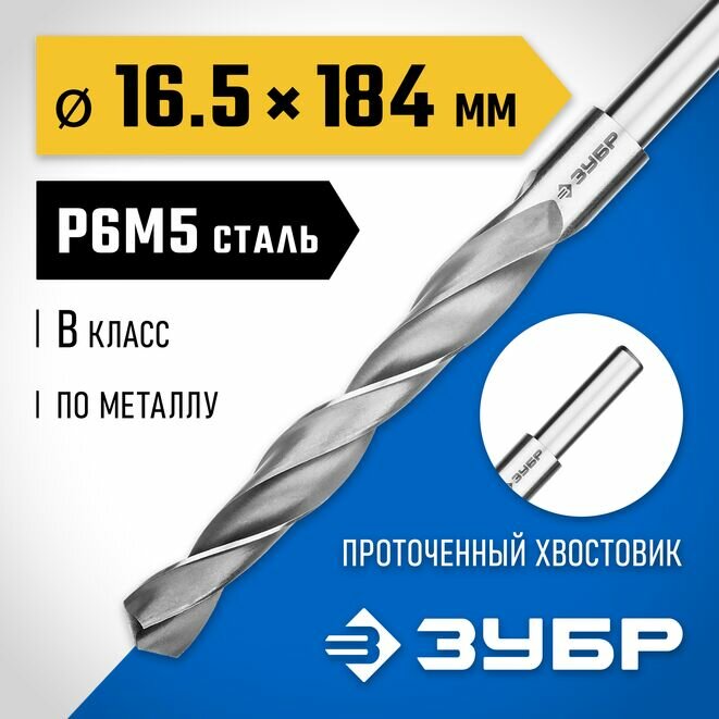 Сверло по металлу Зубр ПРОФ-В проточенный хвостовик, сталь Р6М5, класс В, 16.5х184мм