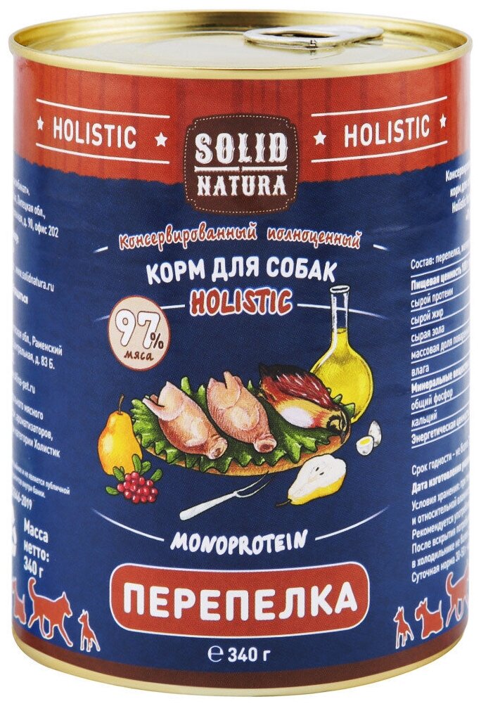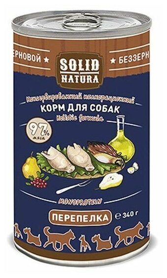 Solid Natura с перепёлкой - консервированное влажное питание для собак. Беззерновое. Холистическое.Монопротеиновое. Одновременное применение данных качеств создаёт синергетический эффект. Изготовлено вРоссии из лучших сортов отечественного мяса и птицы.