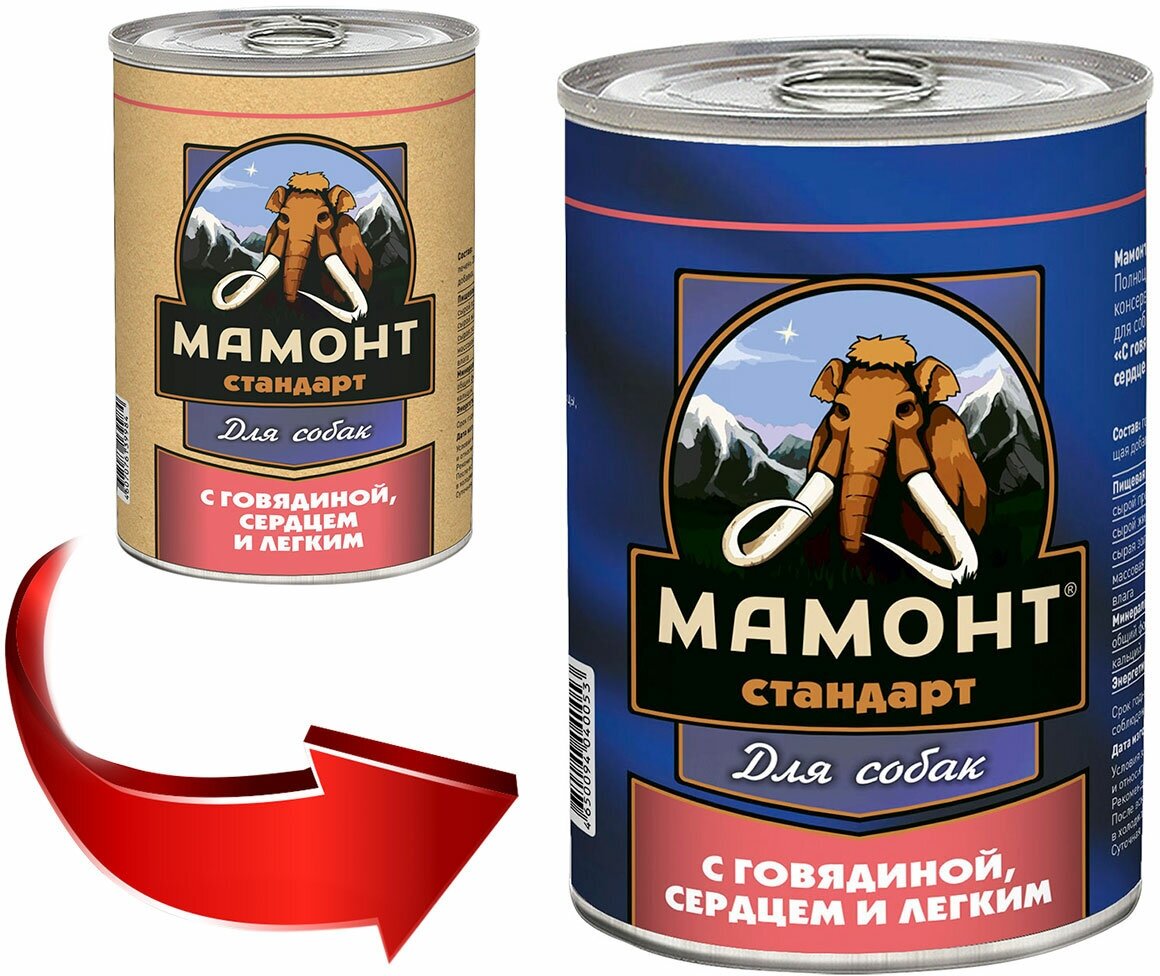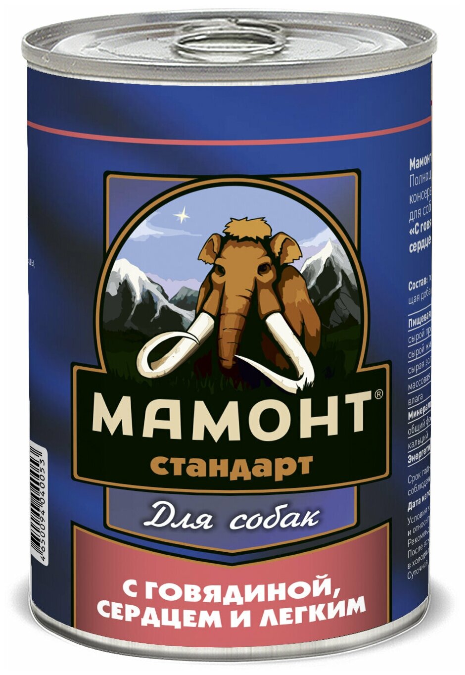 Влажный корм для собак - Мамонт Стандарт с говядиной, сердцем и легкими. Нежная консистенция в виде фарша значительно увеличивает вкусовую привлекательность. В качестве ингредиентов используется только свежие охлажденные говядина, сердце и легкие. 100% натуральное влажное питание, изготовленное из мяса высшей категории.