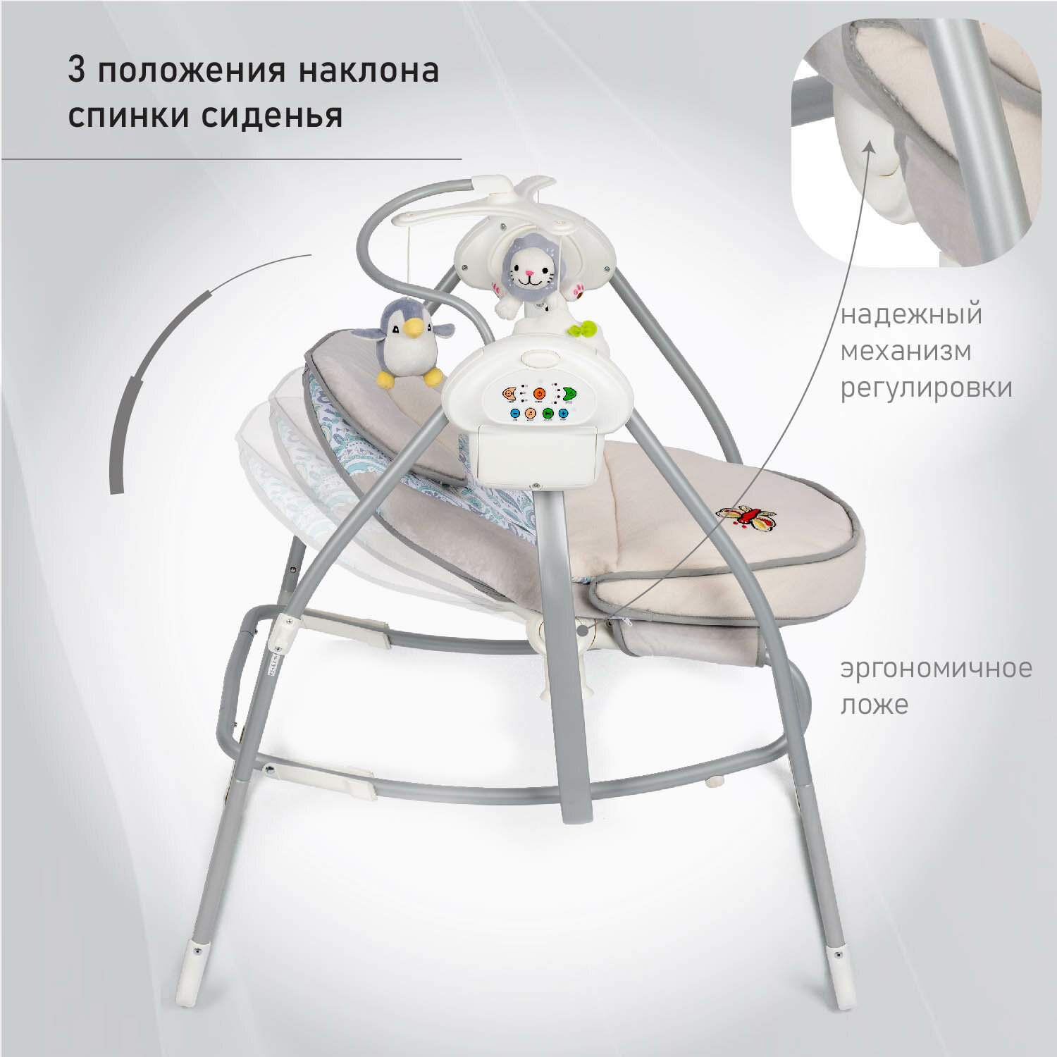 Название модели электрокачелей «Migliore» переводится с итальянского как «лучший», и к этому мало что можно добавить: в этом устройстве, и правда, предусмотрено все, что только может потребоваться малышу и его родителям. Эргономичное и изящное основание. Мягкое, невероятно уютное креслице с удобными вкладками из приятного на ощупь материла. Пятиточечные ремни безопасности и накидка на ножки. Все это сделает пребывание младенца в электрокачелях приятным, беззаботным и безопасным: он с удовольствием будет дремать под аккомпанемент убаюкивающих мелодий или, напротив, увлеченно познавать окружающий мир, протягивая ручки к висящим над ним игрушкам. Родители же по достоинству оценят надежный механизм укачивания, продуманность и прочность конструкции и, конечно же, приятный дизайн в пастельных тонах с декоративными элементами в виде вышивки. Эти электрокачели станут незаменимым помощником в семье с младенцем: они гарантированно подарят комфорт малышу и избавят от множества забот его родителей.