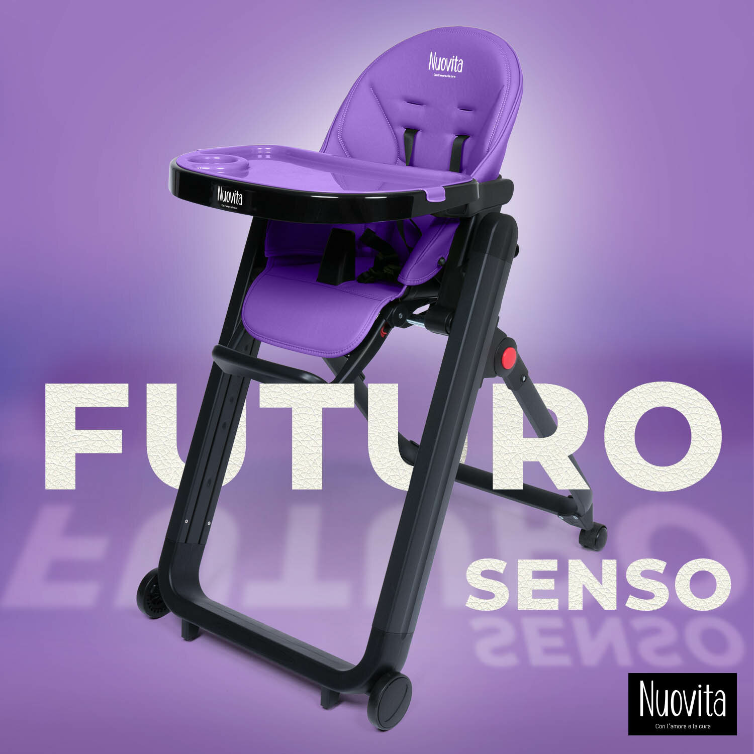 При необходимости можно передвинуть стульчик, с Nuovita Futuro Senso не возникнет никаких затруднений, поскольку данная модель имеет две пары колёс, снабжённых резиновым покрытием. Для фиксации колёс предусмотрены стопора. Особенностью именно данной модели является постоянно включенное состояние стопоров, что избавит родителей от необходимости фиксировать колёса вручную после перемещения. Незаметное расположение рукояток не позволит более старшим детям перевозить стульчик с малышом.