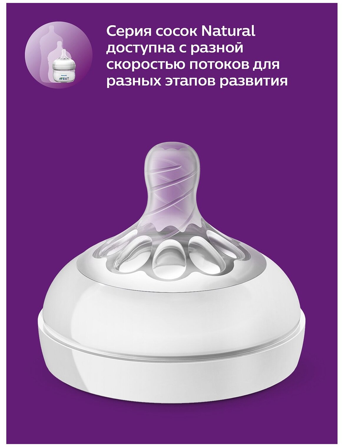 В линейке Philips Avent Natural есть соски различной мягкости и скорости потока, которые подойдут для разных этапов развития вашего малыша.