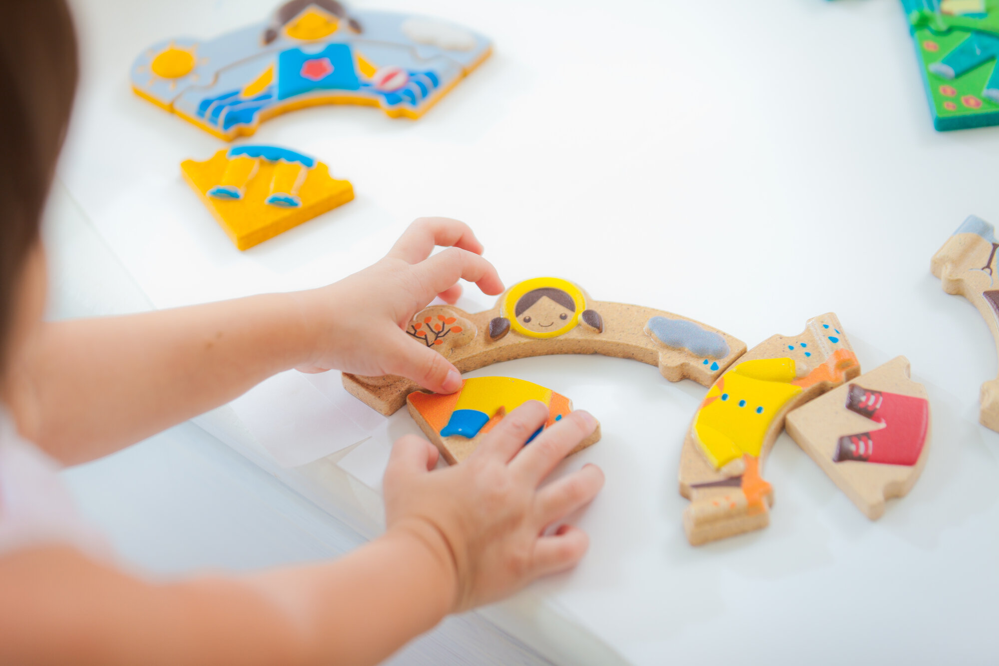 Малыш должен последовательно собрать весь пазл, собрав детей на прогулку. Необходимо соединять деревянные элементы пазла с изображениями мальчиков и девочек в различных одеждах.
